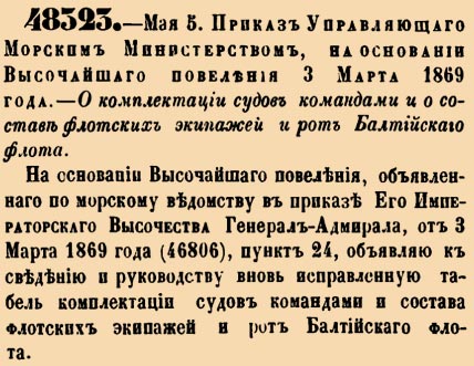 48323. 1870 год. 17 мая (5 мая ст.ст.) Приказ Управляющаго Морским Министерством, на основании Высочайшаго повеления 3 марта 1869 года. О комплектации судов командами и о составе флотских экипажей и рот Балтийскаго флота.НА основании Высочашаго повеления, объявленнаго по морскому ведомству в приказе Его Императорскаго Высочества Генерал-Адмирала, от 3 марта 1869 года (46806), пункт 24, объявляю к сведению и руководству вновь исправленную табель комплектации судов командами и состава флотских экипажей и рот Балтийскаго флота <…>
