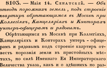 8103. 1740 год. 26 мая (14 мая ст.ст.). Сенатский. Об отводе порожних земель, под строение квартир обретающимся в Москве при Коллегиях, Канцеляриях и Конторах унтер-офицерам и рядовым.Обретающимся в Москве при Коллегиях, Канцеляриях и Конторах унтер-офицерам и рядовым под строение квартир отвесть порозжия земли в пристойных местах, по силе Именнаго Ея Императорскаго Величества указа <...>