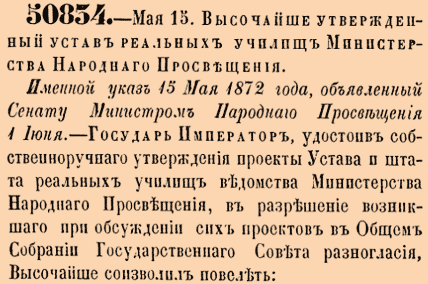 50834. 1872 год. 27 мая (15 мая ст.ст.) Высочайше утвержденный устав реальных училищ Министерства Народнаго Просвещения. Гл. I.-I. Общие положения. 1.Реальныя училища имеют целью доставлять учащемуся в них юношеству общее образование, приспособленное к практическим потребностям и к приобретению технических познаний. <...>