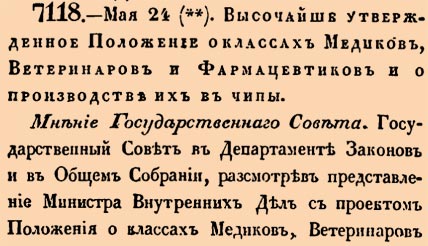 7118. 1834 год. 5 июня (24 мая ст.ст.) Высочайше утвержденное Положение о классах Медиков, Ветеринаров и Фармацевтиков и о производстве их в чины№1 Всякому лицу, имеющему Медицинскую, Ветеринарную или Фармацевтическую ученую степень, при вступлении в службу, присвояется соответствующий оной класс, а именно: 1) Докторам Медицины и Хирургии 7-й. 2) Докторам Медицины, Медико-Хирургам, Штаб-Лекарям и Старшим Ветеринарным Врачам 8-й. 3) Аптекарям и Лекарям по Медицинской части 9-й. 4) Ветеринарным Лекарям и Провизорам 10-й. 5) Кандидатам Медицины, Фармации и Ветеринарной науки 13-й. 6) Гезелям и Ветеринарным Помощникам 1-го Отделения 14 класс. <…>