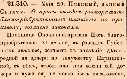 21310. 10 июня (29 мая ст.ст.) 1804 г. Именный, данный Сенату. О праве каждаго распоряжаться благоприобретенным имением по произволу, согласно законам.<…> Повелеваем: чтобы впредь каждый располагая благоприобретенными имениями по произволу, мог отдавать, дарить и завещать их на таких условиях о образе пользования и управления ими, какия за благо признает,лишь бы условия сии общим Государственным законам не были противны.