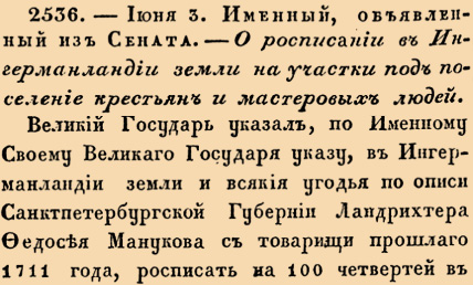 2536. 1712 год. 14 июня (3 июня ст.ст.) Именный, объявленный из Сената. О росписании в Ингерманландии земли на участки под поселение крестьян и мастеровых людей. Великий Государь указал, по Именному Своему Великаго Государя указу, в Ингерманландии земли и всякия угодья по описи Санктпетербургской Губернии Ландрихтера Федосья Манукова с товарищи прошлаго 1711 года, росписать на 100 четвертей в поле, а в дву потому ж, под дворы и огороды и гумна 15 десятин на выпуск <…>