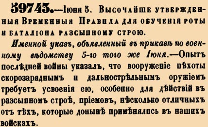 59743. 1879 год. 17 июня (5 июня ст.ст.) Высочайше утвержденныя Временныя Правила для обучения роты и баталиона разсыпному строю. Именной указ, объявленный в приказе по военному ведомству 5-го того же Июня. Опыт последней войны указал, что вооружение пехоты скорозарядным и дальнострельным оружием требует усвоения ею, особенно для действий в разсыпном строе, приемов несколько отличных от тех, которые доныне применялись в наших войсках <…>