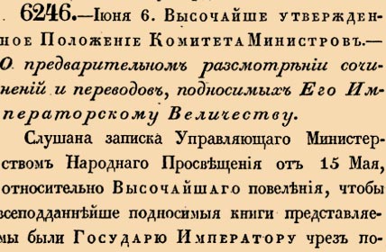 6246. 1833 год. 6 июня (18 июня). Высочайше утвержденное Положение Комитета Министров. О предварительном разсмотрении сочинений и переводов, подносимых Его Императорскому Величеству.