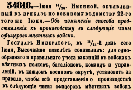 54818. 1875 год. 26 июня (14 июня ст.ст.). Именной, объявленный в приказе по военному ведомству 22-го того же Июня. Об изменении способа представления к производству в следующие чины офицеров местных войск.Государь император, в 14/26-й день сего Июня, Высочайше повелеть соизволил: для однообразнаго и правильнаго учета ваканций в войсках местных полков, баталионов, команд и управлений, в каждом военном округе, установить за правило, чтобы все представления о производстве в следующие чины офицеров местных войск на ваканции и за выслугу лет восходили в Главный Штаб <…>