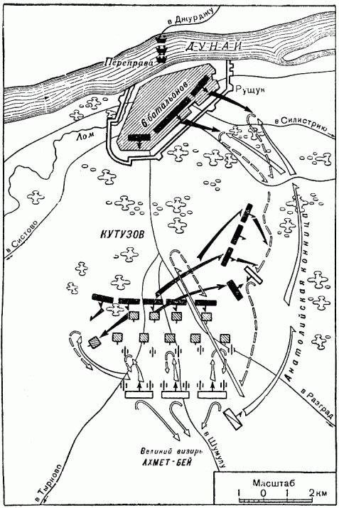 План Рущукского сражения 4 июля 1811 года 1811 год. 4 июля (22 июня ст.ст.) во время русско-турецкой войны 1806–1812 гг. русская армия под командованием М. И. Кутузова под Рущуком нанесла поражение турецким войскам Ахмет-паши.Турецкое командование предполагало выйти в тыл армии Кутузова, отрезать ее от Рущукского гарнизона, прижать к Дунаю и уничтожить. Разгадав намерения противника, Кутузов смог сосредоточить войска на угрожаемых направлениях, и результате чего русская армия отразила все атаки турок и нанесла им поражение.