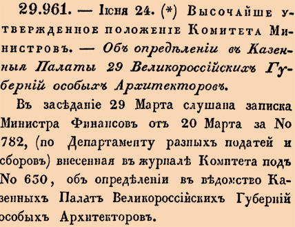 29961. 1824 год. 6 июля (24 июня ст.ст.) Высочайше утвержденное положение Комитета Министров. Об определении в Казенныя Палаты 29 Великороссийских Губерний особых Архитекторов.Записка. В ведомстве Казенных Плаат 29-ти Великороссийских Губерний, находится ныне значительное число казенных строений, как то: винных и сольных магазинов, дистанционных подвалов и питейных домов, для освидетельствования коих при постройках и починках, также для сочинения смет и планов, необходимо нужно иметь в распоряжении Палат особых Чиновников, знающих Архитектуру <…>