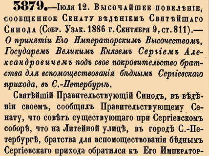 3879. 1886 год. 24 июля (12 июля ст.ст.) Высочайшее повеление, сообщенное Сенату ведением Святейшаго Синода. О принятии Его Императорским Высочеством, Государем Великим Князем Сергием Александровичем под свое покровительство братства для вспомоществования бедным Сергиевскаго прихода, в С.-Петербурге.<…> Государь Император, по всподданейшему о сем докладу Исправляющаго должность Синодальнаго Обер-Прокурора, в 12-й день Июля 1886 года, Высочайше соизволил на принятие Его Высочеством под Свое покровительство означеннаго братства.