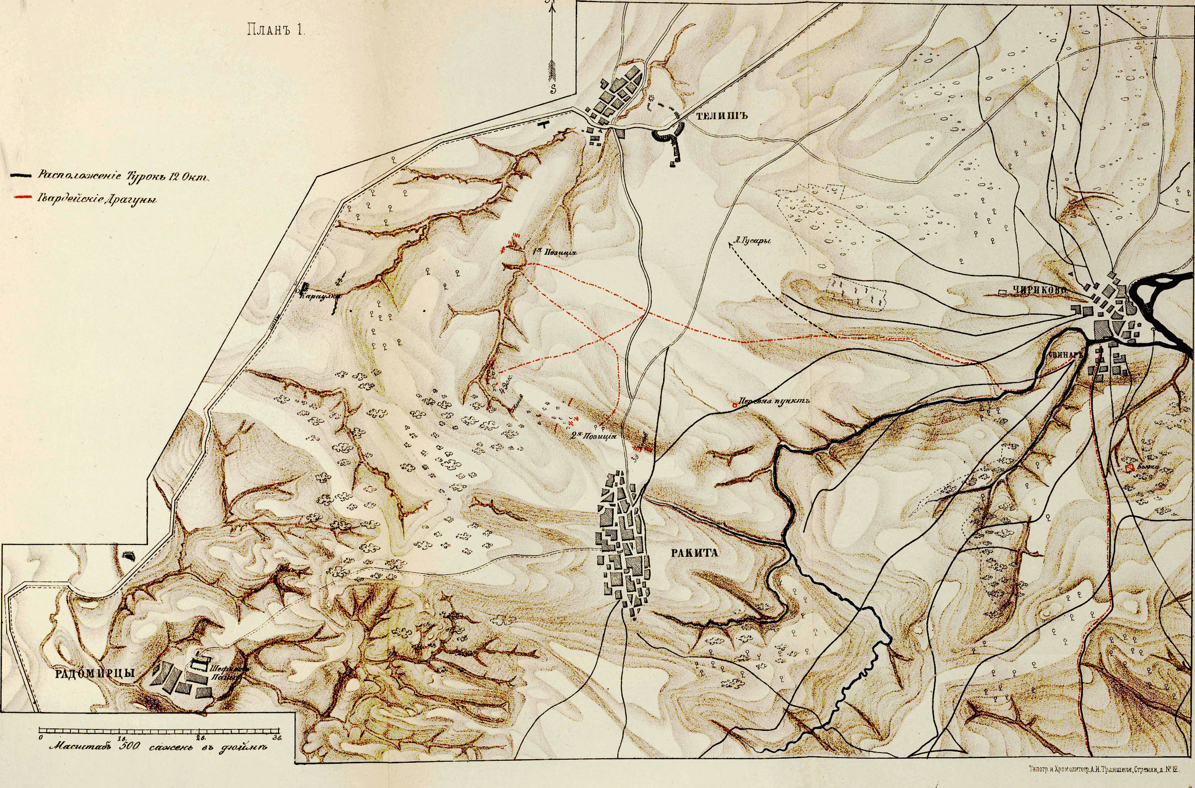 Участие в сражении под Телишем 12-го октября Выступление под Телиш. 11-го числа вечером, приказом по полку, велено было приготовиться к выступлению, для чего пополнить сухарные саквы из запаса до 6-ти-дневной порции, людям взять с собою по 1/2 ф. вареной говядины и соли, а для лошадей суточную дачу ячменя иметь в саквах. Сено можно было найти везде на полях. Обоз велено было оставить на месте, а взять с собою только лазаретную линейку и вьючных офицерских лошадей. Еще ранее полуночи, в 11 ½ часов с 11-го на 12-е число, л.-гв. Гусарский и л.-гв. Драгунский полки с 5-ю конною батареею, под начальством командующего Гусарским полком полковника Мейндорфа, выступили из д. Бежаново. Выступление состоялось в полнейшей тишине; в полголоса отдавались приказания седлать лошадей, садиться и двигаться. Ночь была темная и довольно свежая. Отряд медленно вытягивался по дороге, через р. Вид на д. Свишар. У брода и при подъеме на скалистую гору, артиллерия замедлила несколько движение отряда. В 2Ѵ2 часа пополуночи, отряд достиг д. Свинар. Полуэскадрон от л.-гв. Гусарскаго полка служил авангардом отряда; потом следовал гусарский полк, за ним батарея, а далее Драгунский полк, имея у себя арьергард из 2-го полуэскадрона 4-го эскадрона. На протяжении всего отряда были высланы к стороне неприятеля дозорные. Так как ночь была тихая, то были приняты все меры, чтобы движение отряда не было замечено неприятелем, посты которого были расположены не далее трех верст за д. Свинар и Свинарского балкою. В д. Свинар были оставлены офицерские вьюки. Проследовав в таком же порядке через д. Свинар, отряд втянулся в Свинарскую балку. Здесь встретились большия затруднения при частых переездах через ручей, про-текающей в глубоком логовище, где артиллерия беспрестанно останавливалась, а орудия приходилось в иных местах перетаскивать через ручей, с помощью орудийной прислуги. Пройдя, лесную часть оврага, отряд собрался в 41/г часа утра, верстах в пяти от телишских укреплений, и остановился, в ожидании рассвета, в безмолвной тишине; к стороне Телиша на полверсты были выставлены от Драгун и Гусар пикеты из 6-ти человек каждый. Начало боя под Телишем. В 7 часов утра, когда уже стало рассветать, командующий полком полковник Ковалевский получил приказание, присоединив к себе взвод 5-й гвардейской конной артиллерии капитана Мартынова, двинуться вперед и действовать во время боя на левом фланге всей атаки, охраняя тыл Лейб-Егерей, когда они, завернув левым плечом, двинутся на Телиш. Немедленно полк вытянулся из оврага, выслав вперед на рысях наездников от всего полка под командою капитала Мейнандера, для освещения местности по направлению к д. Раките и к Софийскому шоссе. Полк же сперва следовал во взводной общей колонне, имея между дивизионами взвод артиллерии, а выйдя на равнину, между Телитскими укреплениями и Ракитской горой, развернулся во взводных колоннах на тесных интервалах, имея артиллерию позади, подвигался по направленно к шоссе. К стороне д. Телиш был выслан разъезд из 8 человек с унтер-офицером по гребню идущего туда оврага. Лейб-Гусары завязали уже дело для обнаружения расположения ложементов неприятеля, а за ними следовали Лейб-Егеря. Было 9 часов утра; посланный к стороне Телиша разъезд был встречен выстрелами из ложементов и должен был отойти из-под огня назад и ограничился только наб