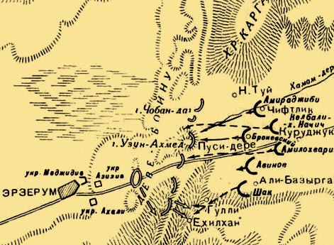 С самого начала боя, артиллерия нашего правого фланга, почти без перерыва, обстреливала левую часть возвышенности Узун-Ахмат. В течение 9-ти часового действии из наших орудий, на этой возвышенности было произведено четыре взрыва зарядных ящиков, а сел. Узун-Ахмат еще с утра дымилось в пламени, и было оставлено турками. Для окончательной же подготовки успешной атаки, наша артиллерия, с 4-х часов пополу-дни, т. е. тотчас же по очищении неприятелем предгорьев Чобан-дага, открыла самый сильный и частый огонь картечными гранатами, по траншеям и по вершине левой оконечности Узун-Ахмата. Вслед за этим, полковник князь Амираджиби, уже обеспеченный с тыла, начал наступление, имея в боевой линии два батальона (1-й и 2-й) кубинцев и три батальона eлисаветпольского полка, а во второй линии 3-й кавказский стрелковый батальон, два батальона бакинского полка и один елисаветпольскаго. Быстро и настойчиво двигаясь вперед, штурмовая колонна князя Амираджиби заняла холмы у подошвы Узун-Ахмата, но на этой позиции была встречена страшным перекрестным огнем—ружейным и крупповских орудий, перед которым мог устоять только русский солдат. С верховьев широкого оврага, идущего через Деве-Бойну, со скалистого края Чобан-дага и с траншей Узун-Ахмата, расположенных в два яруса, в нас полетела такая масса пуль и артиллерийских снарядов, о которой трудно дать, даже приблизительное понятие. Вся линия турок скрывалась в дыму, от их ружейной и пушечной пальбы. Неудержимо подвигаясь вперед, кубинцы и елисаветпольцы, несмотря на осыпавший их со всех сторон град пуль, взобрались, наконец, до середины возвышенности Узун-Ахмат. Здесь был дан отдых людям, двигавшимся все время перекатною цепью. Как только люди перевели дух, боевая линия вновь стала подвигаться вперед, с прежнею настойчивостью, по крутизна подъема была настолько велика, что через несколько шагов снова пришлось положить людей. Вслед затем подан был сигнал для наступления. Кубинцы, елисаветпольцы, перемешавшись с людьми 3-го стрелкового батальона, собрались с силами и, с криком «ура!», дружно кинулись вперед по крутой покатости, под дождем свинца. Терраса за террасою, и холм за холмом стали переходить в руки наших войск, неудержимо взбиравшихся на крутизны. Наконец, обе линии сражавшихся скрылись в дыме и крики «ура!» показали, что нижняя траншея уже очищена штыками от турок, которые быстро бежали на верхнее плато возвышенности, оставив в руках кубинцев и елисаветпольцев два орудия, в виде трофеев. По занятии этой траншеи, густая цепь наших стрелков прилегла за ней, стараясь ружейным огнем выбить с вершины Узуни-Ахмата турок, которые начали было уже отступать на правую половину плато. Часть войск князя Амираджиби, направленная в обход левой половины Узун-Ахмата, быстро подвигалась к вершине этой возвышенности и дружною атакою, наконец, заняла окраину верхнего плато. Оставшийся здесь неприятель в страхе бежал с нее на правую оконечность высоты, оставив нам одно крепостное орудие. Недолго шла перестрелка между обеими оконечностями верхнего плато Узун-Ахмата, разделенными небольшой лощиной. Турецкая цепь удержалась здесь только для того, чтобы прикрыть отступление своих батальонов, в беспорядке толпившихся у единственной тропы, пролегавшей здесь между камнями скалистой окраины верхнего плато. Так совершил