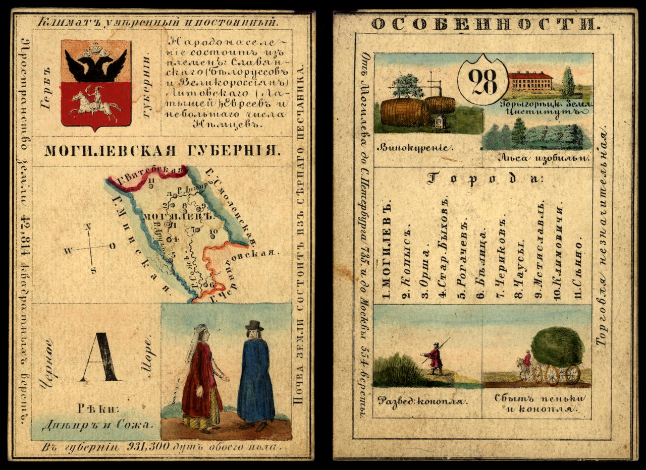 Сувенирный набор из восьмидесяти двух иллюстрированных карточек - одна на каждую область Российской Империи - дает представление о культуре, истории, экономике и географии каждого региона во второй половине девятнадцатого века. На лицевой стороне каждой карточки; изображены характерные черты губернии, ее реки, горы, крупные города и главные отрасли промышленности. На оборотной стороне даны герб губернии, ее карта и информация о климате, природных ресурсах и населении.1856 г.