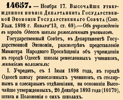 I. Учредить, с 1 Июля 1898 года, в городе Одессе школу ремесленных учеников, с столярным и слесарным отделениями, на основании Высочайше утвержденных, 20 Декабя 1893 года, штата и Положения о сих школах<...>
