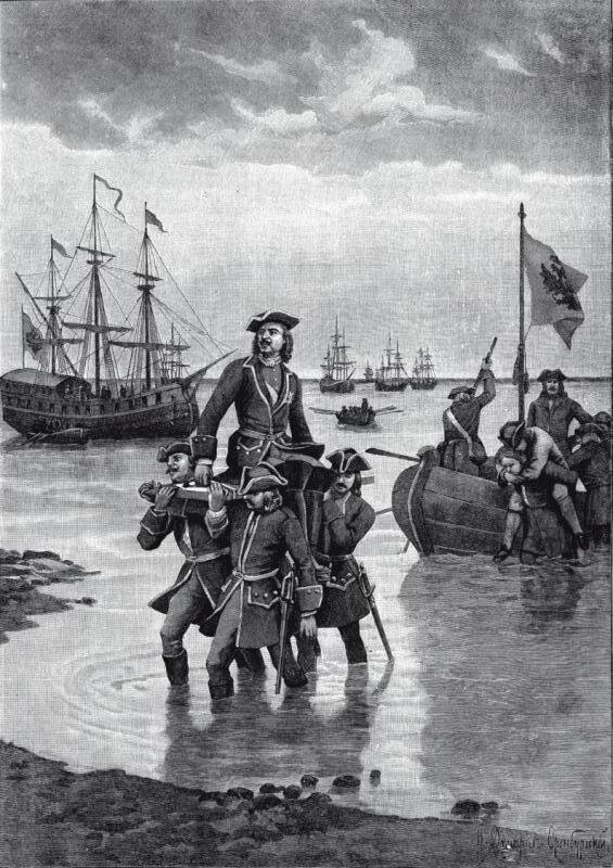Персидский поход Петра Великого. Император Петр I высаживается первым на берег в Аграханском заливе.