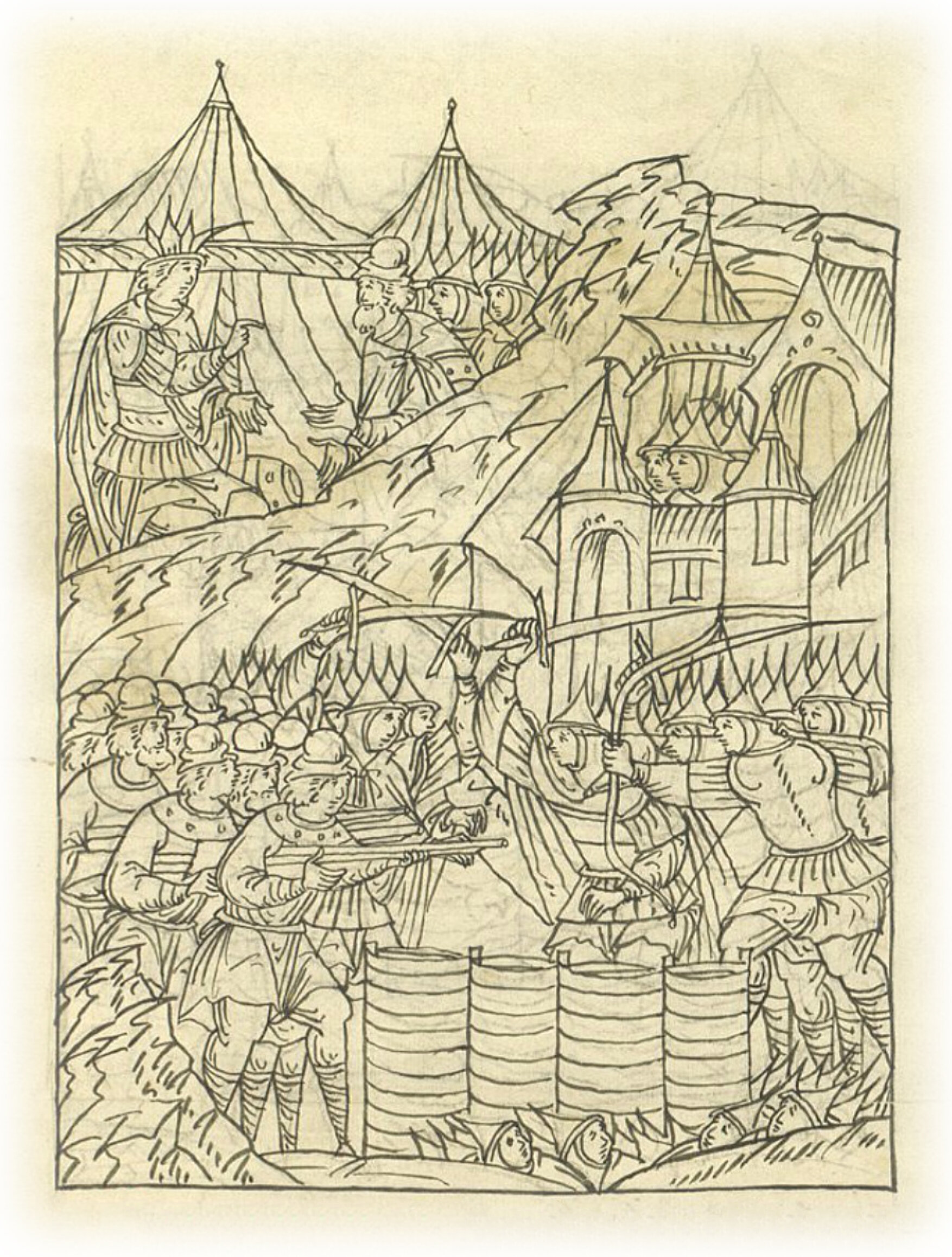 Языки говорят воеводам царя Ивана Васильевича, что магистр окопался большим рвом вокруг города Рындола, бьет из пушек и пищалей и приступает к Рындолу.