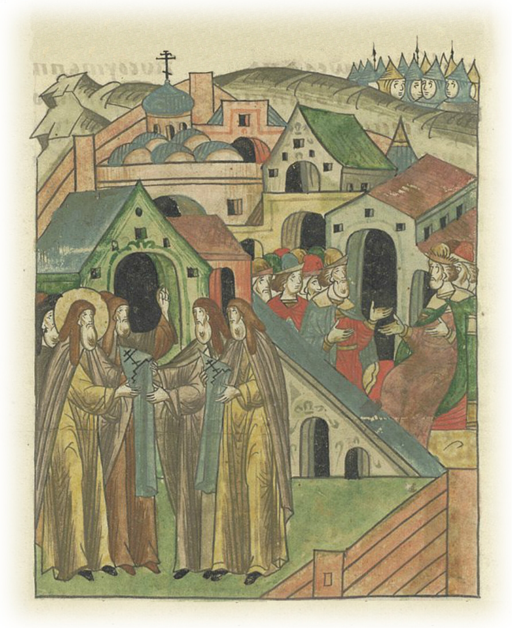 Преподобный игумен Сергий дает воинам Прересвету и Ослябе схимы с нашитыми крестами и велит вместо шлемов возлагать их на головы.