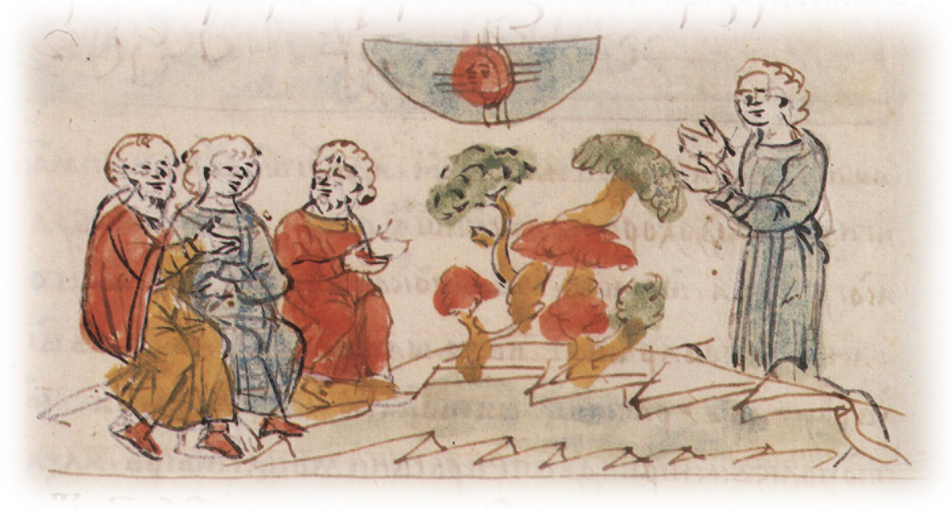 Рисунок "мастера Б" — перо. Правлен (фигуры, лица, дерево) "мастера В" — кисть.