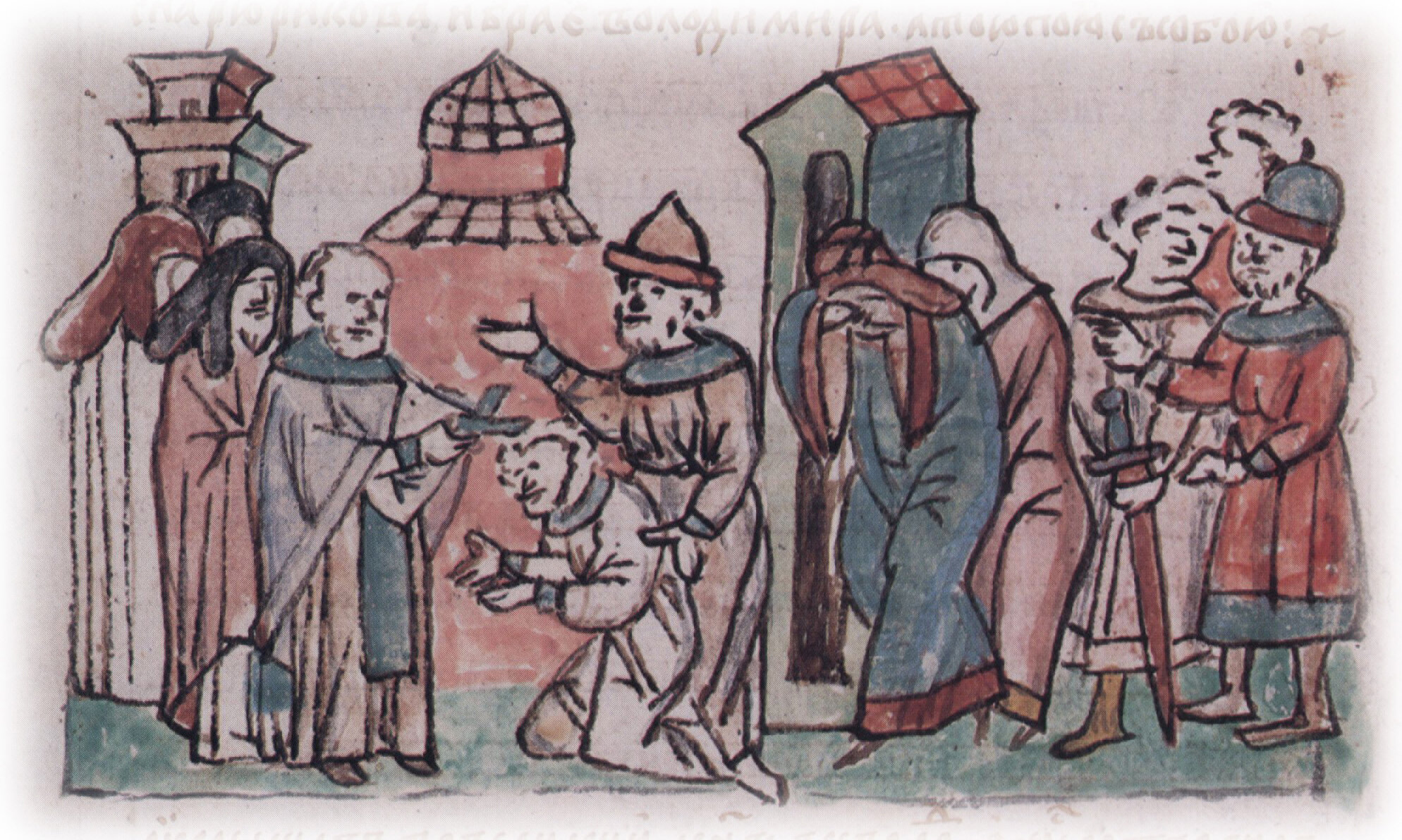 Тайное погребение Владимира Святославича, умершего в Берестове: спуск его тела на землю на ковре между разобранными клетьми здания; положение тела Владимира в мраморный гроб в церкви Святой Богородицы.