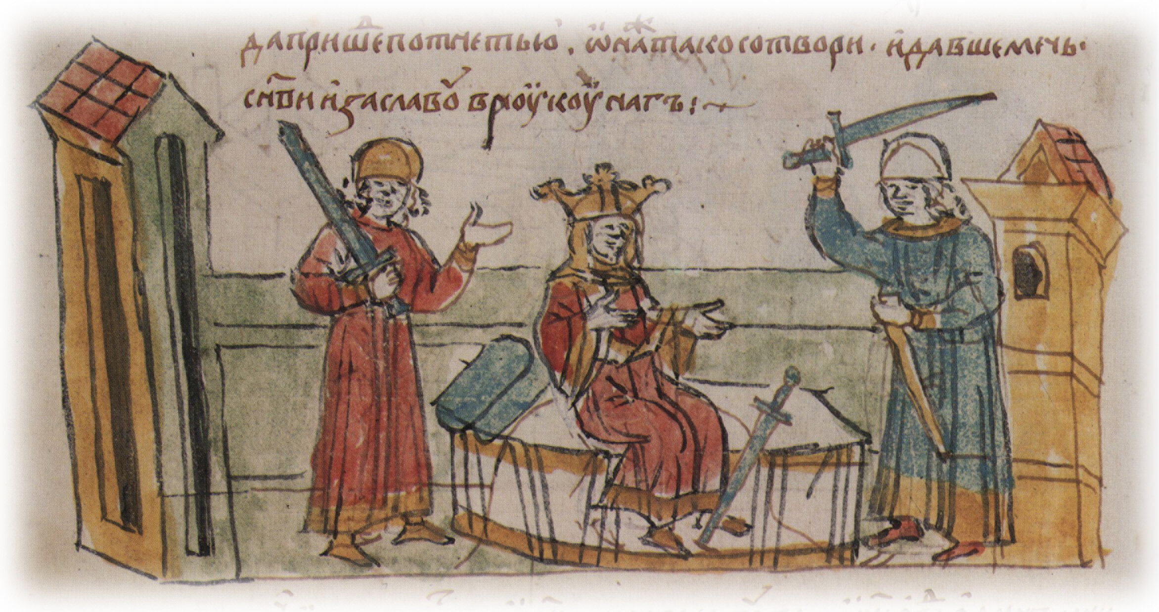 «и повеле ей устроитися во всю тварь царскую... и сести на постеле светле в храмине, да пришед поткнеть іо. Она же... давше мечь сынови Изаславу... рече: "Яко внидет ти отець, рци выступя: «Отечь, егда един мнишися ходя?» Володимер же рече: «А кто тя мнел зде?» И поверг меч свой".