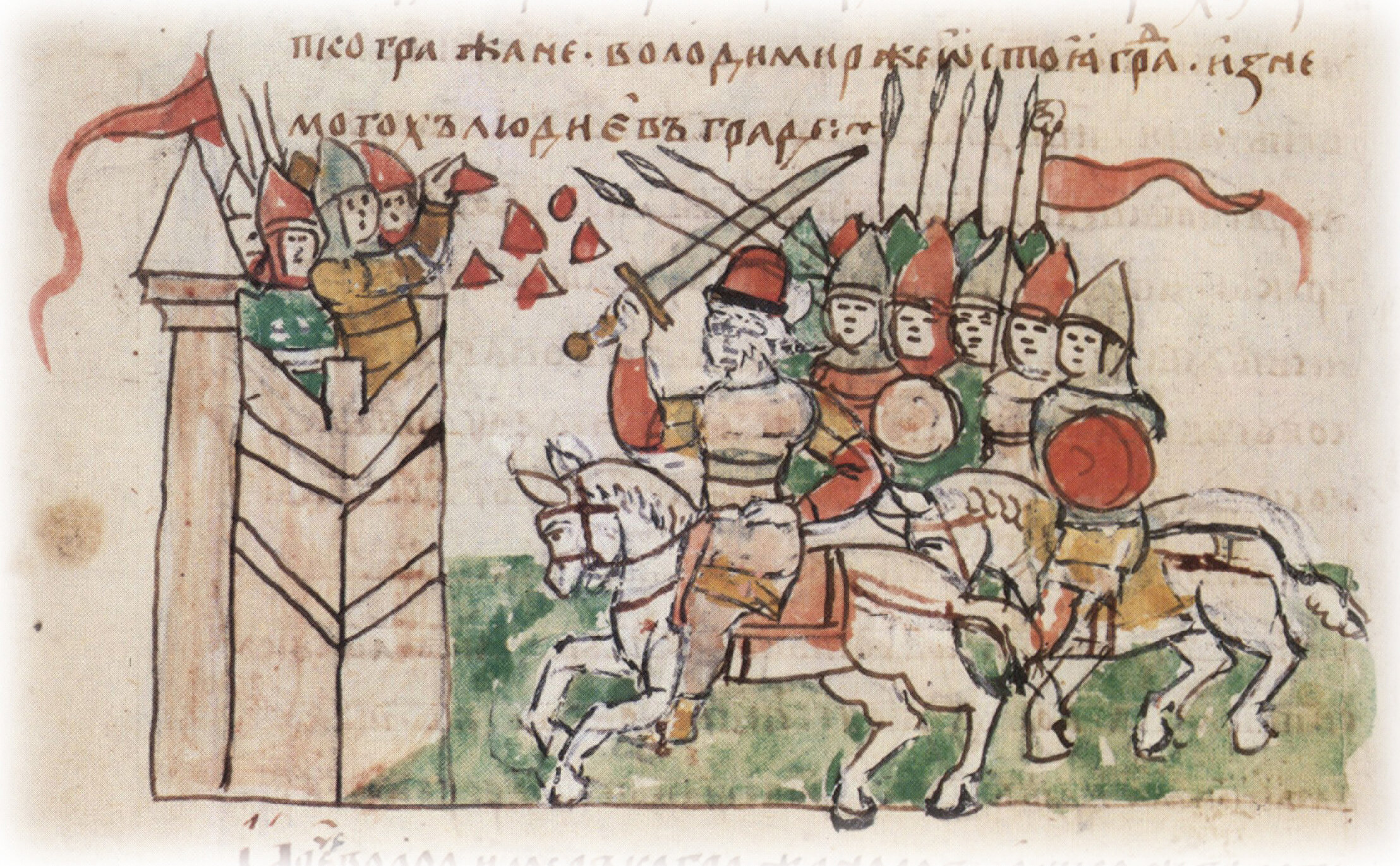 "В лето 6496. Иде Володимир с вой на Корсунь град греческый, и затворишася корсуняне в граде... И боряхуся крепко гражане. Володимир же остоя град. Изнемогох людие в граде".