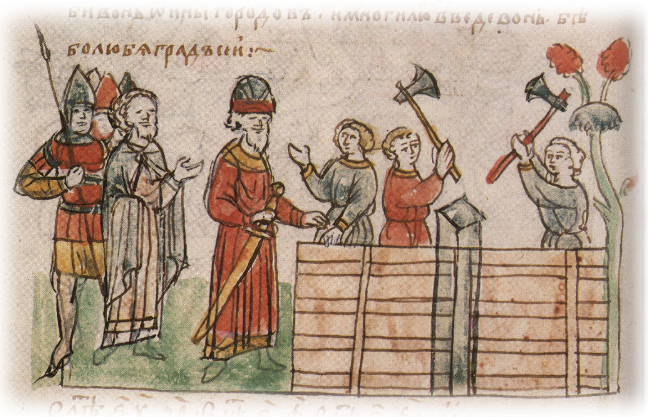 Тайное погребение Владимира Святославича, умершего в Берестове: спуск его тела на землю на ковре между разобранными клетьми здания; положение тела Владимира в мраморный гроб в церкви Святой Богородицы.