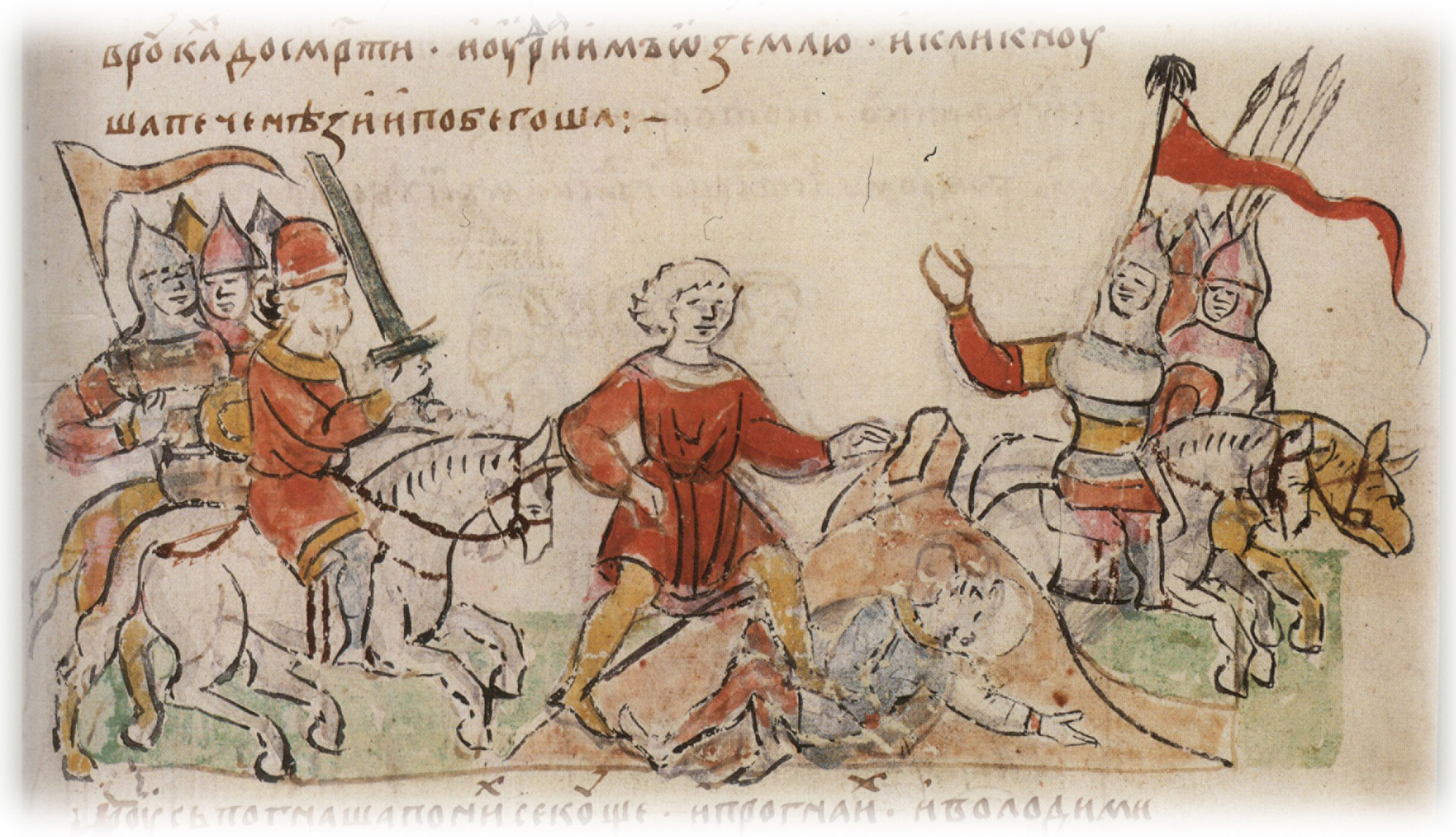 "И размеривше межи обема полкома... и удави печенеженя в руках до смерти. И удари им о землю. И кликнуша печенези и побегоша. И русь погнаша по них секуще, и прогна их".