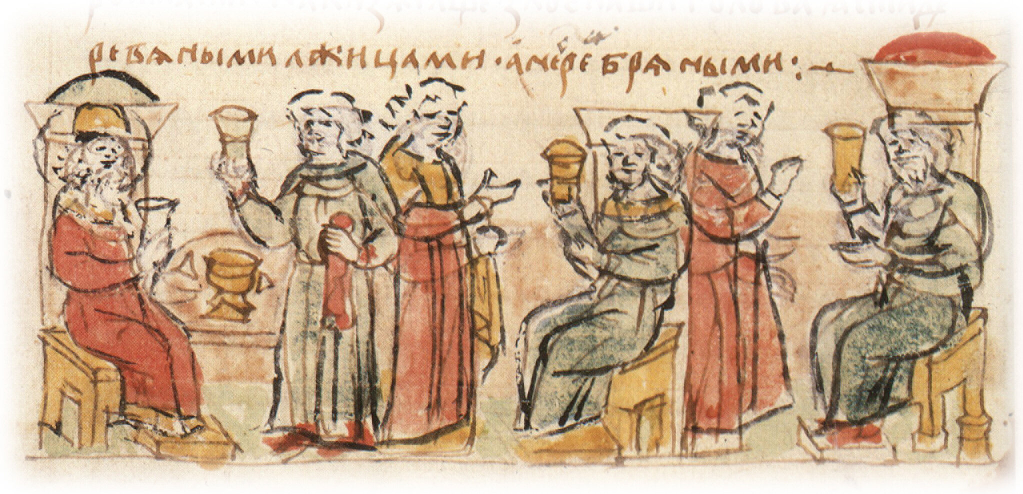 "Се же паки творяше людем своим: по вся неделя устави на дворе в гридници пир творити, приходити бояром своим, и людем, и сотником, и десятьским, и нарочитым князем, и людем нарочитым, при князе и без князя. ...И егда подпьяху, и начаша роптати на князя..."