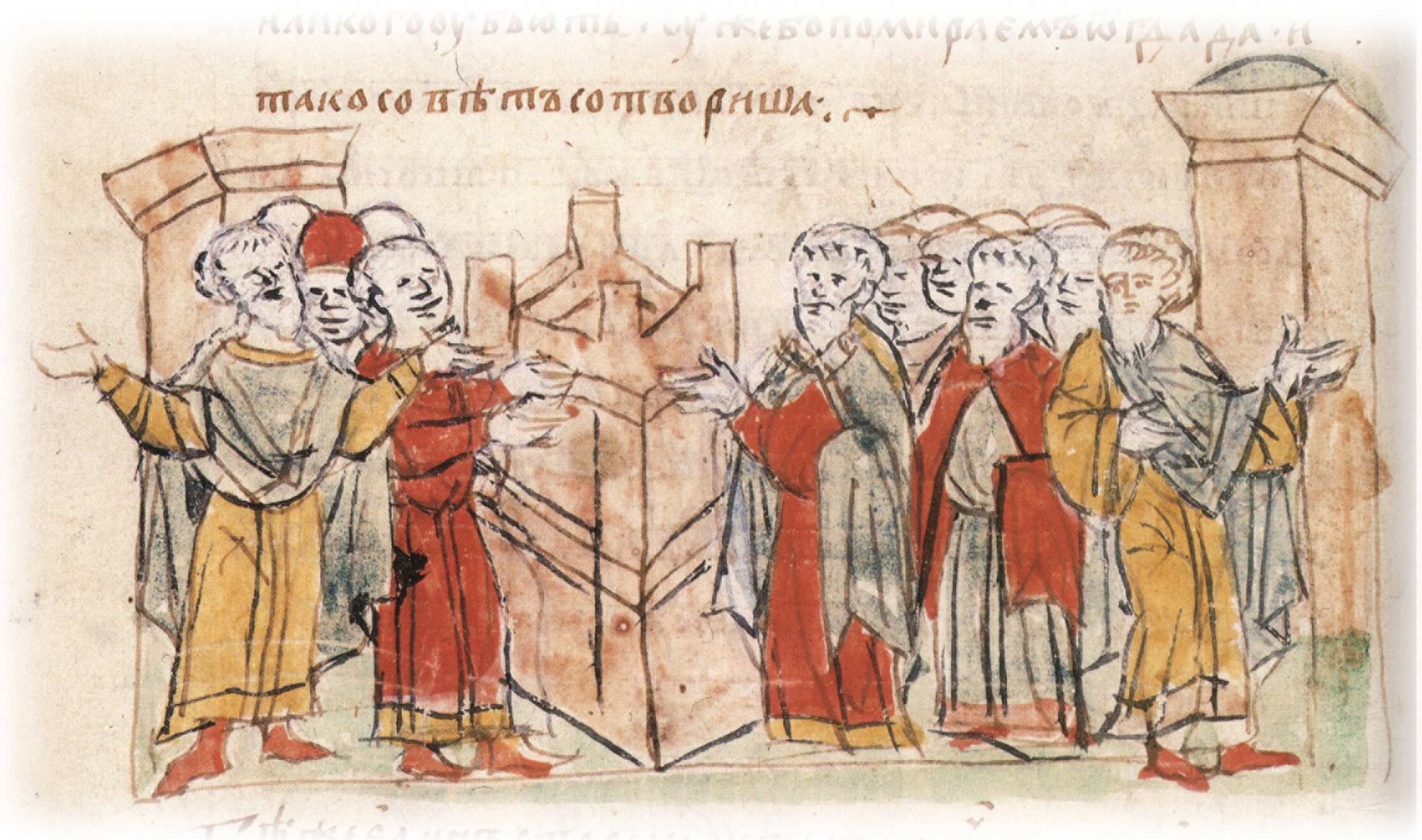 Решение на вече осажденных в городе Белгороде сдаться печенегам, чтобы избежать смерти от голода; просьба одного из старцев, обращенная к жителям города, не сдаваться в течение трех дней.