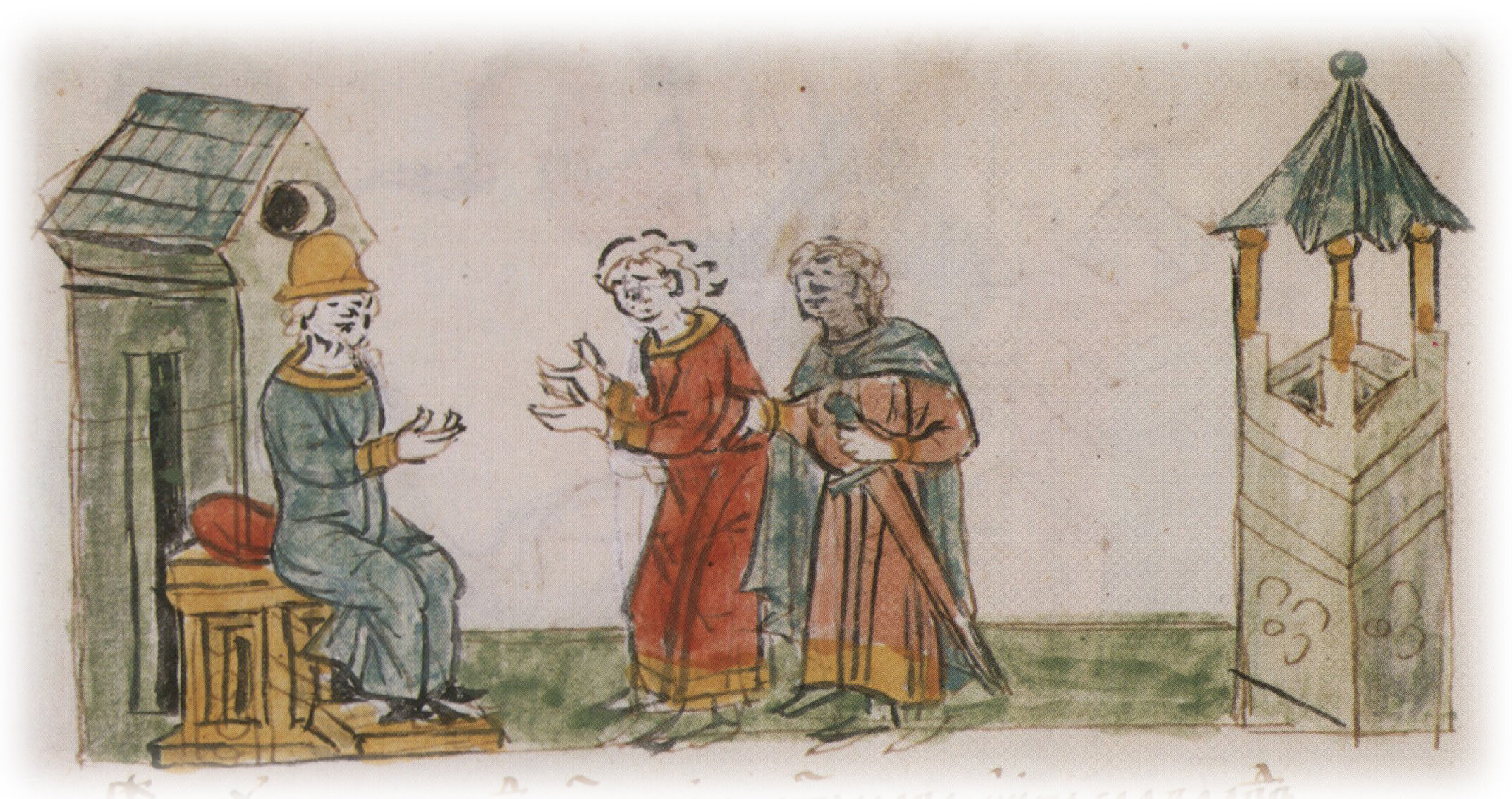 Рисунок "мастера Б" — перо. Правлен (фигуры, лица, шапка, меч, стол, архитектура) и дополнен (киворий справа) "мастера В" — кисть.