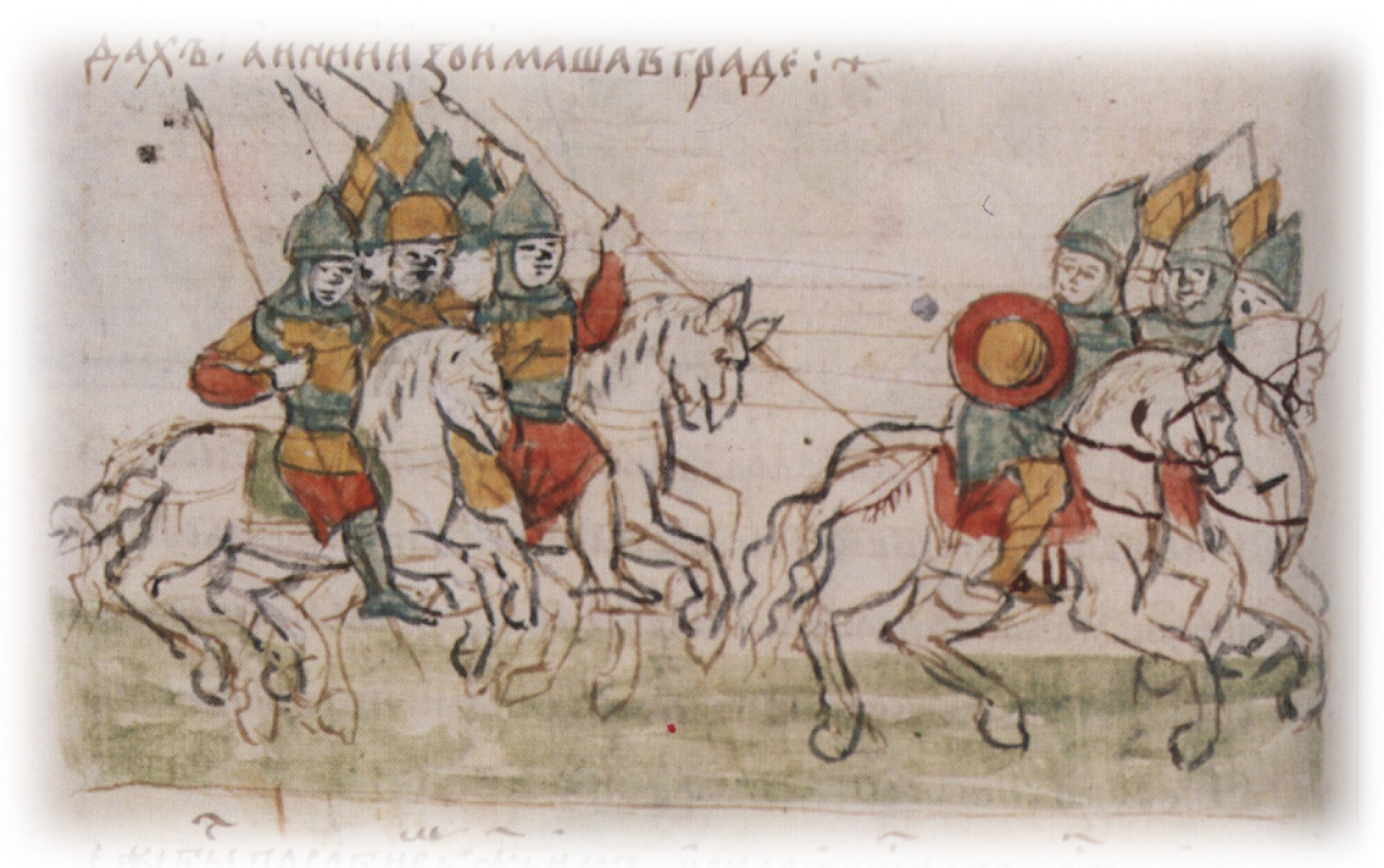 Рисунок "мастера Б" — перо. Правлен (фигуры, лица, шапка, шлемы, копья, щит, лошади) "мастера В" — кисть. Позднейшая пририсовка сбруи и стремени в группе воинов справа — перо