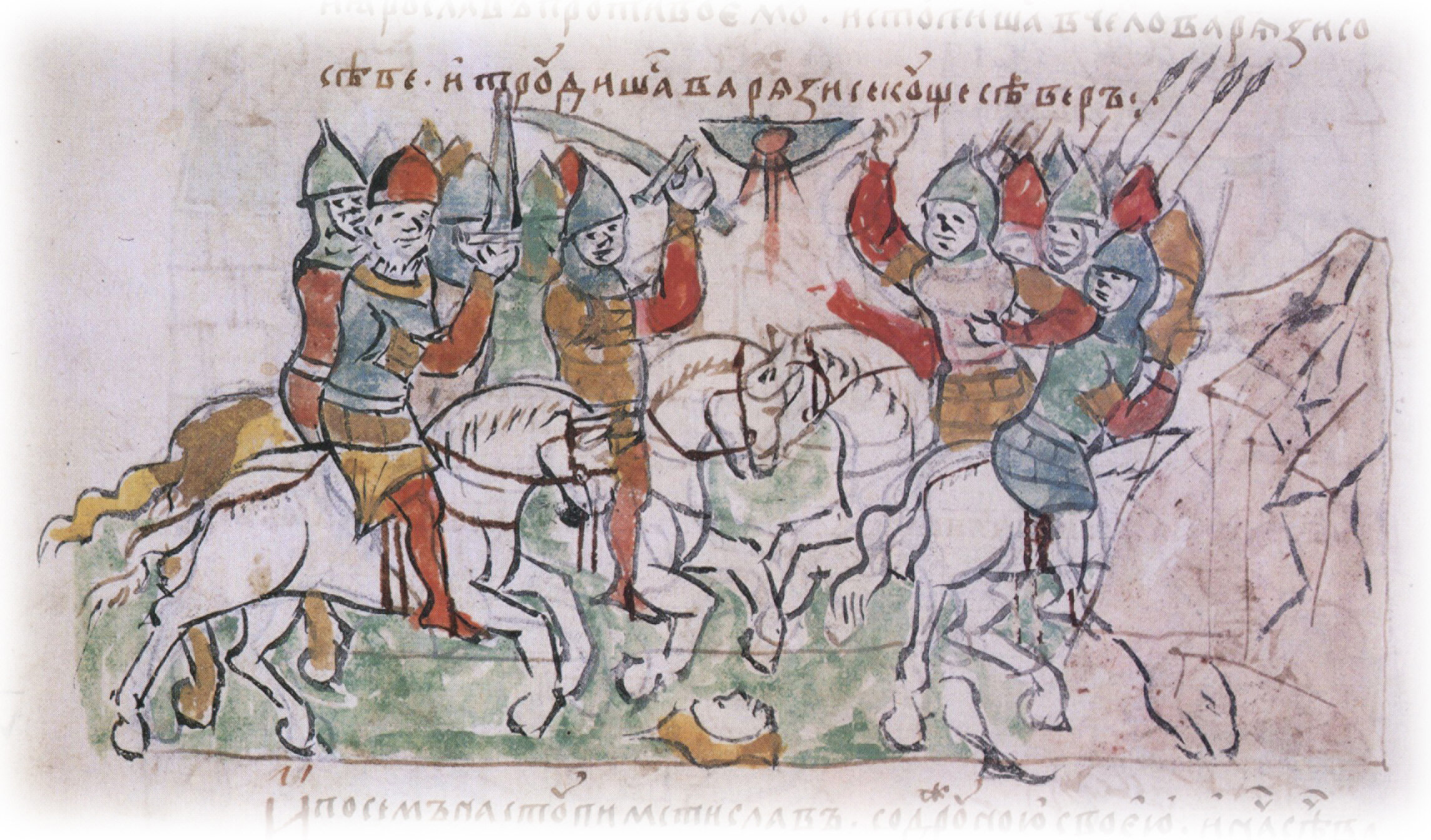 "В лето 6532. ...И поиде Мстислав, и Ярослав противу ему... И бысть сеча силна, и яко блисташа молыньа, и блисташеся оружье, и бе гроз велика и сеча силна и страшна".
