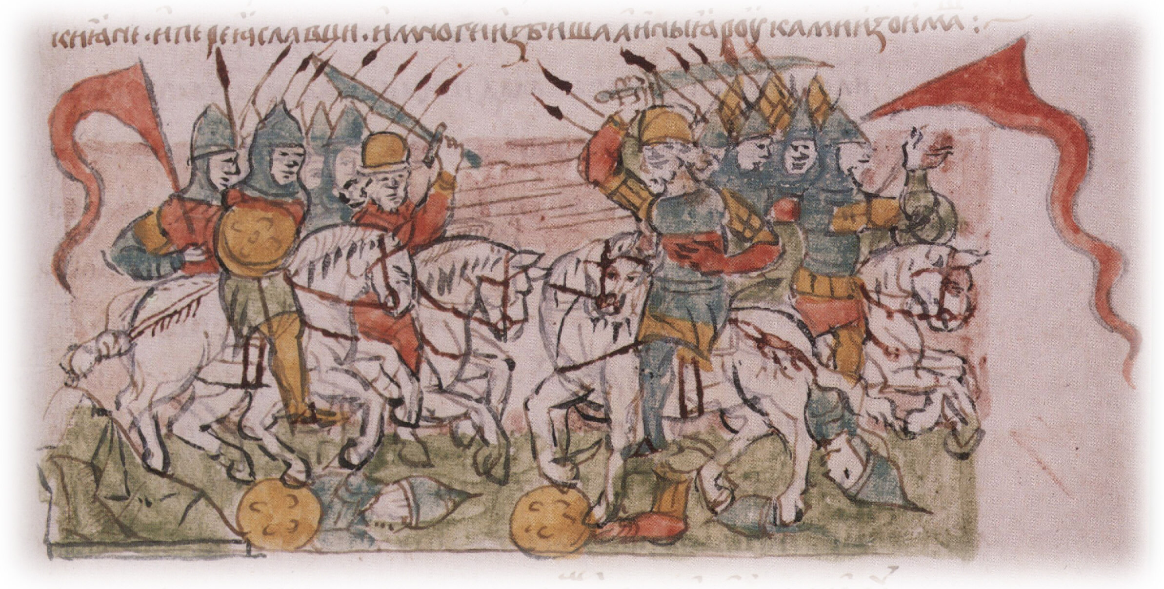 Рисунок "мастера Б" — перо. Правлен (фигуры, лица, шапки, шлемы, лошади, холм) и дополнен (знамена) "мастера В" — кисть. Позднейшая пририсовка сбруи, стремян и наконечников копий — перо.