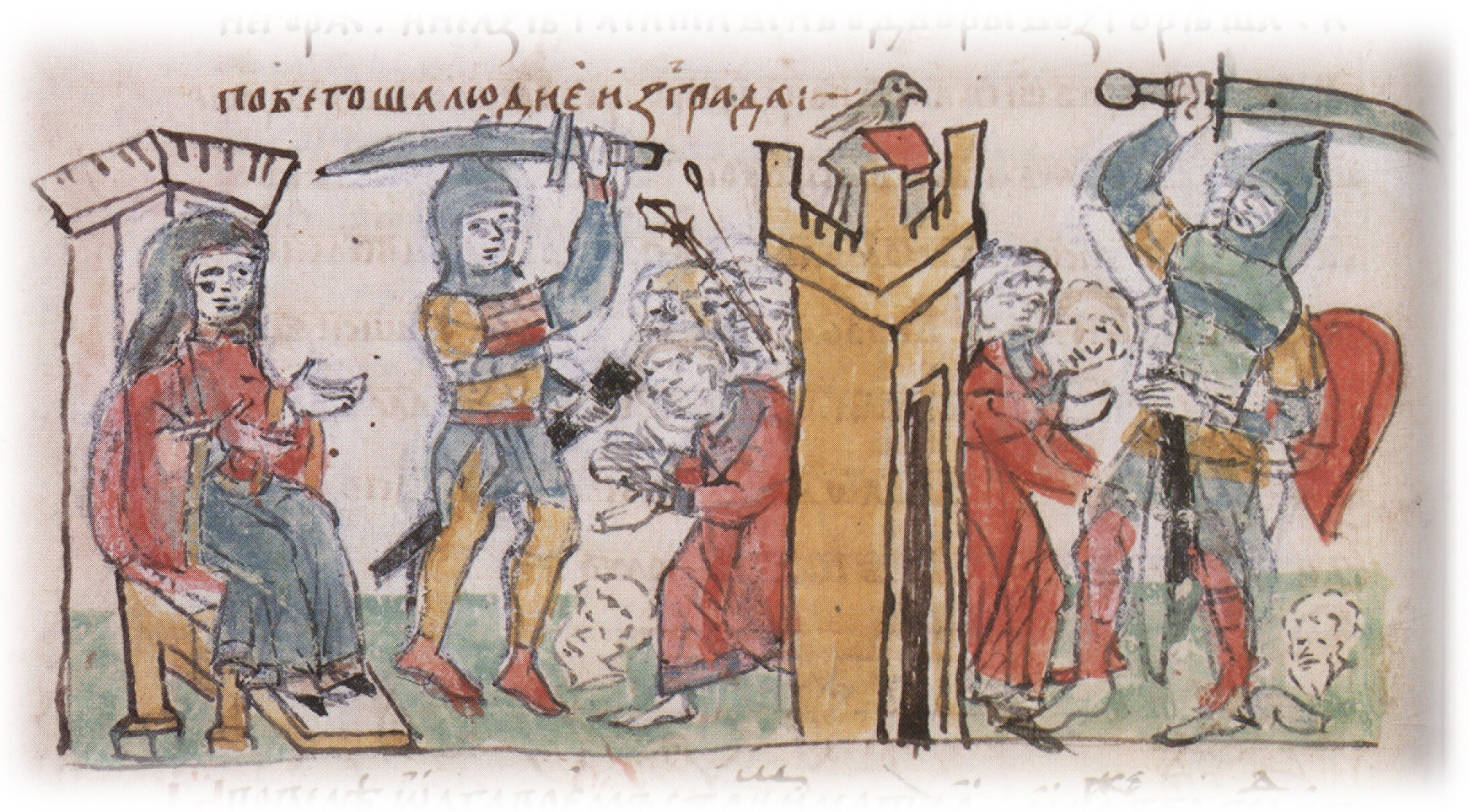 "Повеле Олга, и яко смерчеся, пустити голуби и воробьи воем своим. И Воробьеве же и голуби влетеша во гнезда своа, голуби в голубники, Воробьеве же под застрехи. И тако возгарахуся... Яко же взя град и пожъже и; старейшины же града изыма, и прочаа люди — овех изби...".