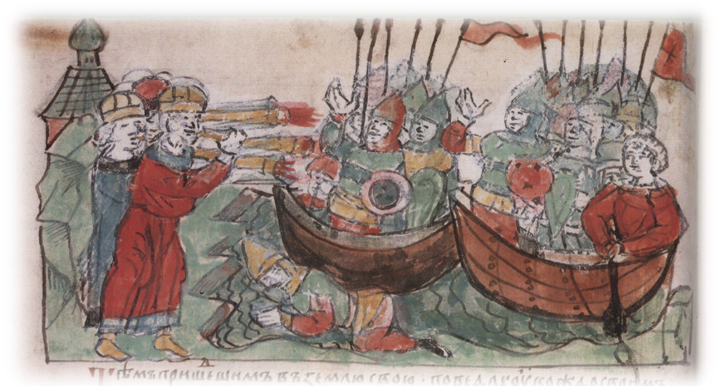 Сожжение части русских кораблей; попытки русских воинов спастись в воде; отплытие уцелевшей дружины в родные края.
