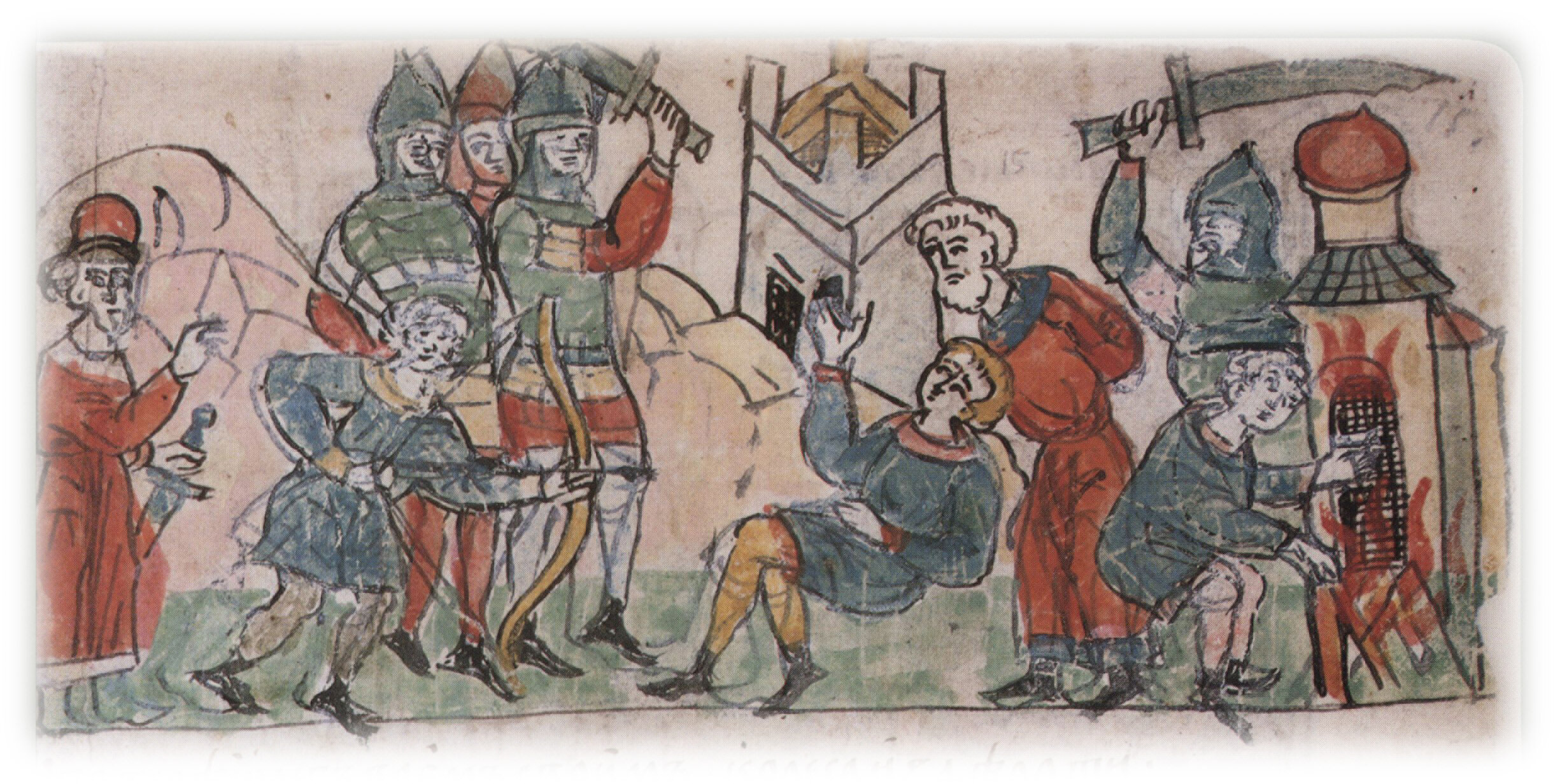 Высадка Олега с воинами на греческий берег; расправа с населением, разрушение и сожжение многих строений.
