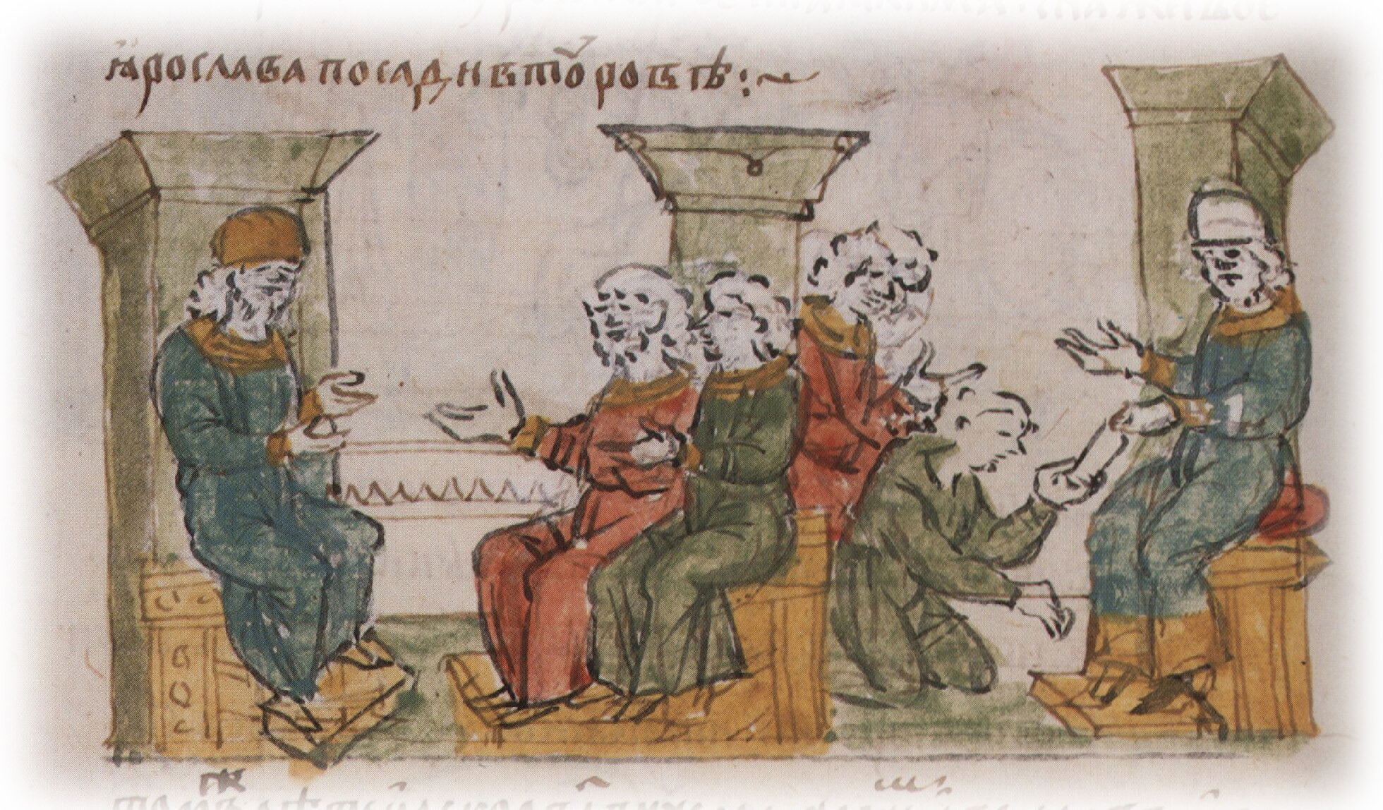 Рисунок "мастера Б" — перо. Правлен (фигуры, лица, шапки, столы, архитектура) и дополнен (коленопреклоненная фигура со свитком) "мастера В" — кисть
