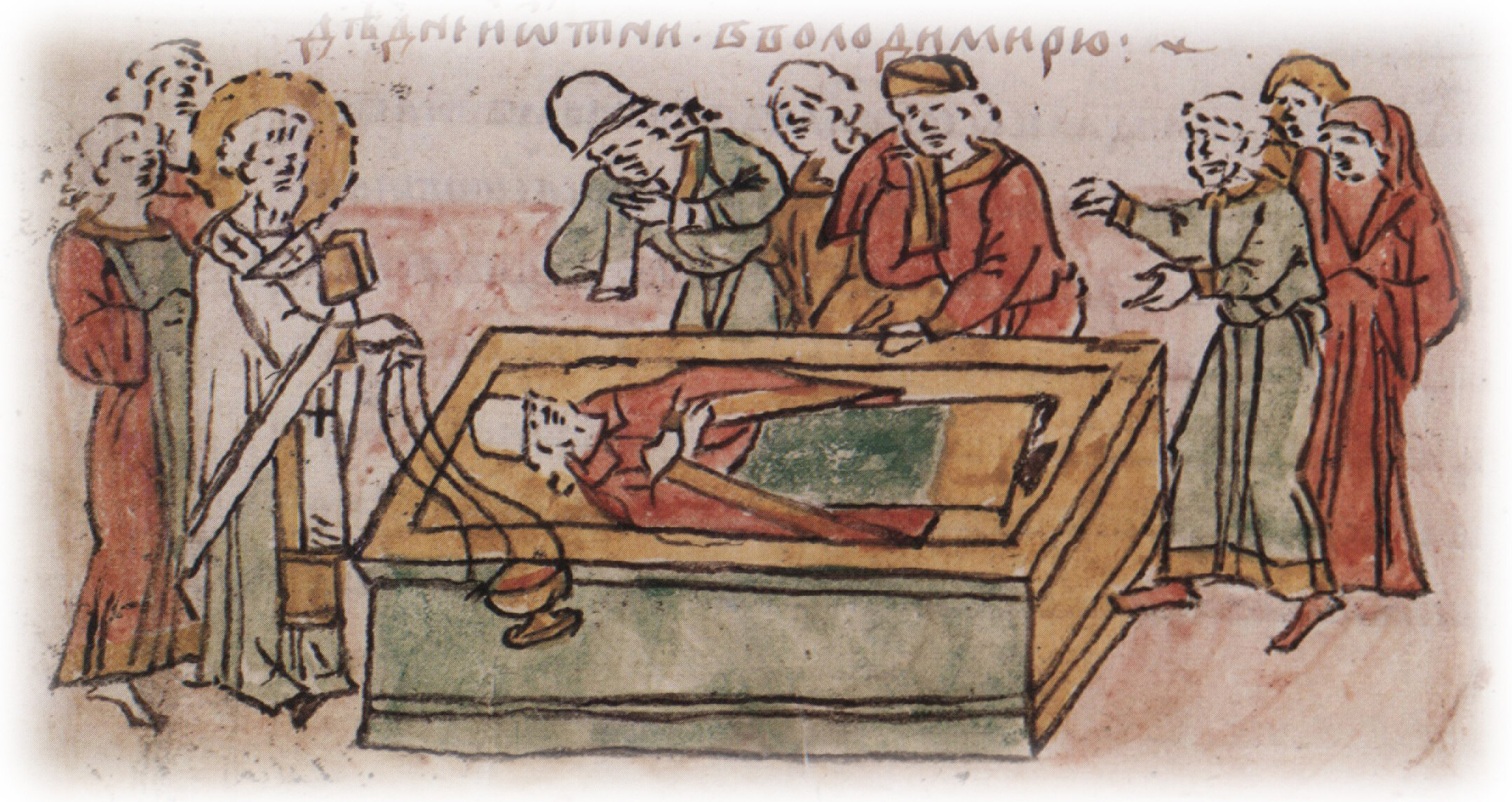 Тайное погребение Владимира Святославича, умершего в Берестове: спуск его тела на землю на ковре между разобранными клетьми здания; положение тела Владимира в мраморный гроб в церкви Святой Богородицы.