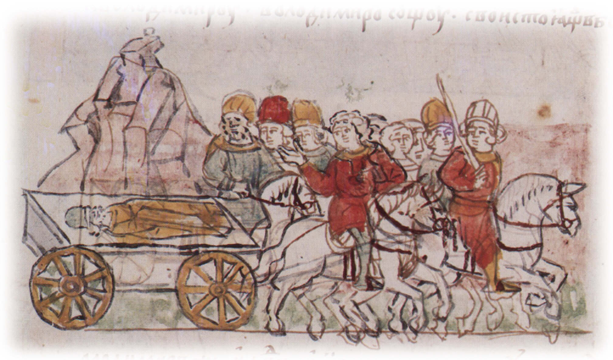 Тайное погребение Владимира Святославича, умершего в Берестове: спуск его тела на землю на ковре между разобранными клетьми здания; положение тела Владимира в мраморный гроб в церкви Святой Богородицы.