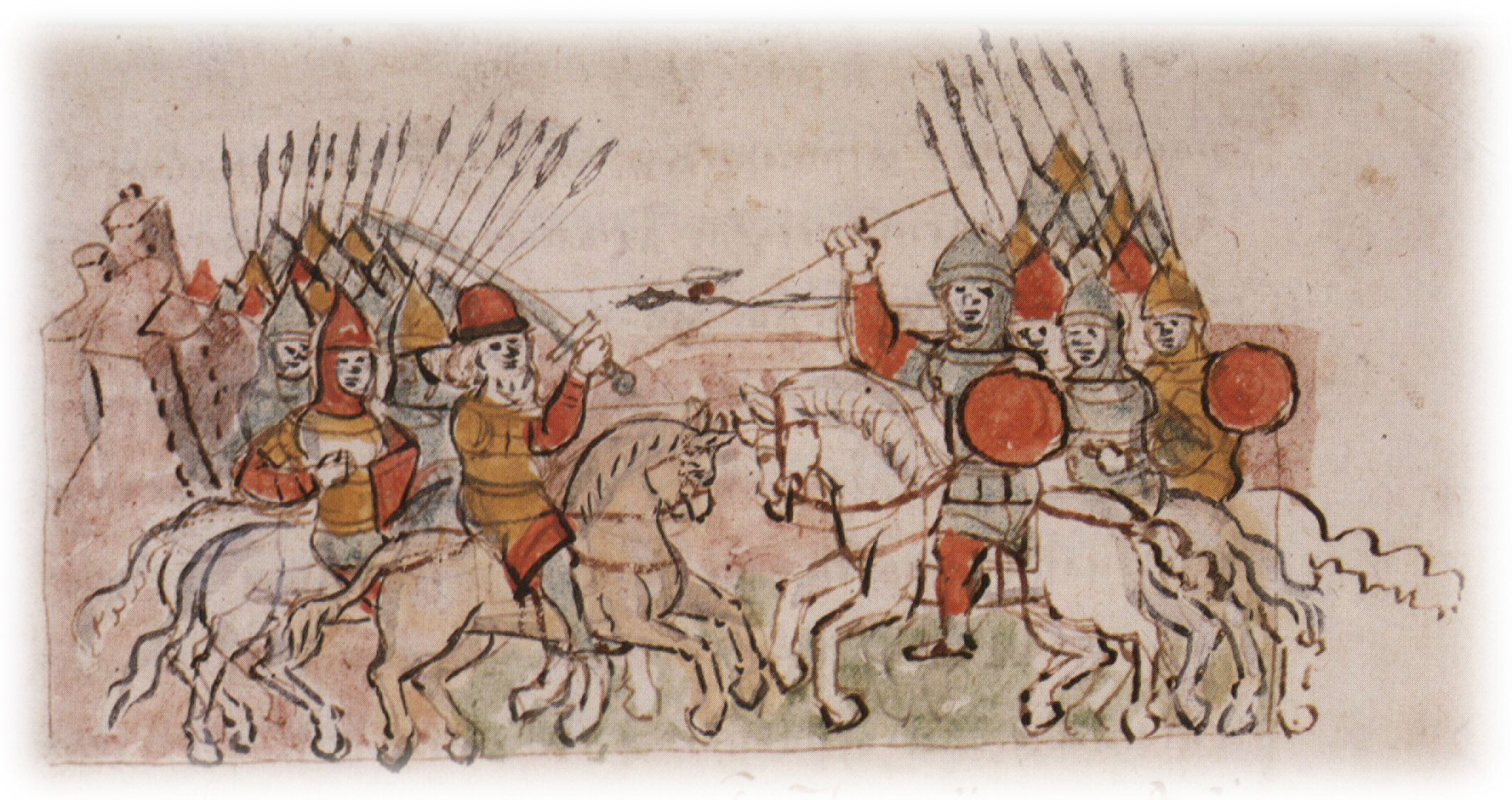Рисунок "мастера Б" — перо. Правлен (фигуры, лица, шапка, шлемы, щиты, копья, лошади, лещадка) "мастера В" — кисть. Позднейшая пририсовка сбруи и стремян — перо.