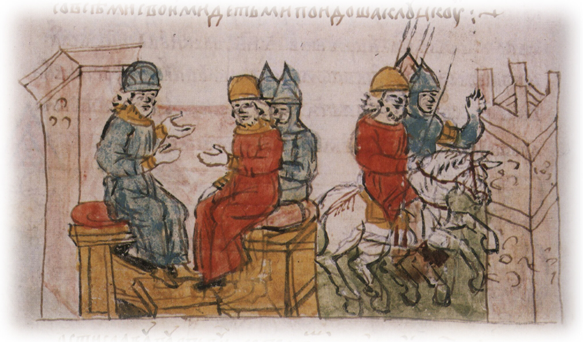 Рисунок "мастера Б" — перо. Правлен (фигуры, лица, шапки, шлемы, копья, столы, лошади) "мастера В" — кисть. Позднейшая пририсовка сбруи и стремени — перо.