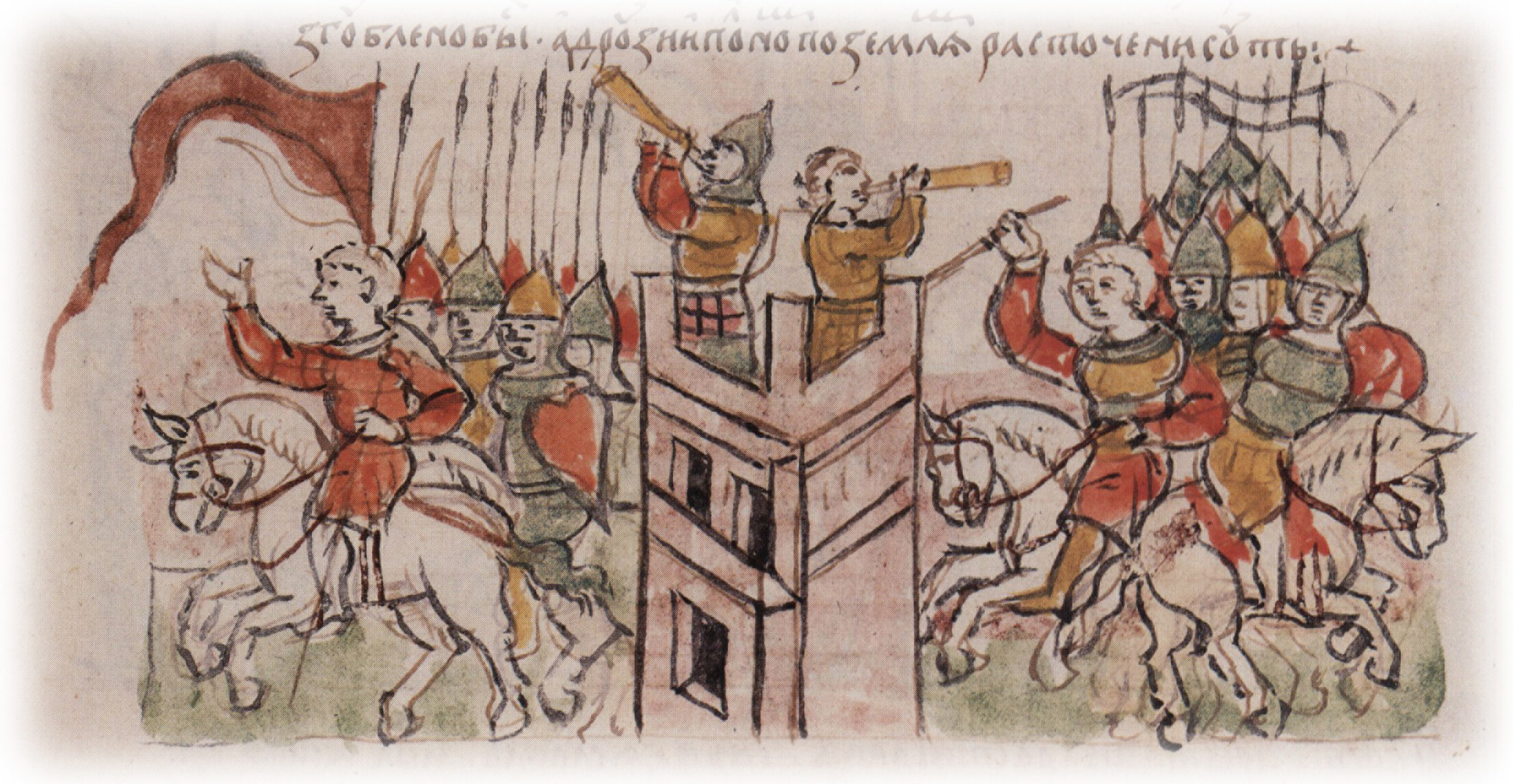 Рисунок "мастера Б" — перо. Правлен (фигуры, лица, шлемы, копья, щиты, труба, знамя слева, архитектура, лошади) и дополнен (знамя справа) "мастера В" — кисть. Позднейшая прирсовка сбруи и стремян — перо.