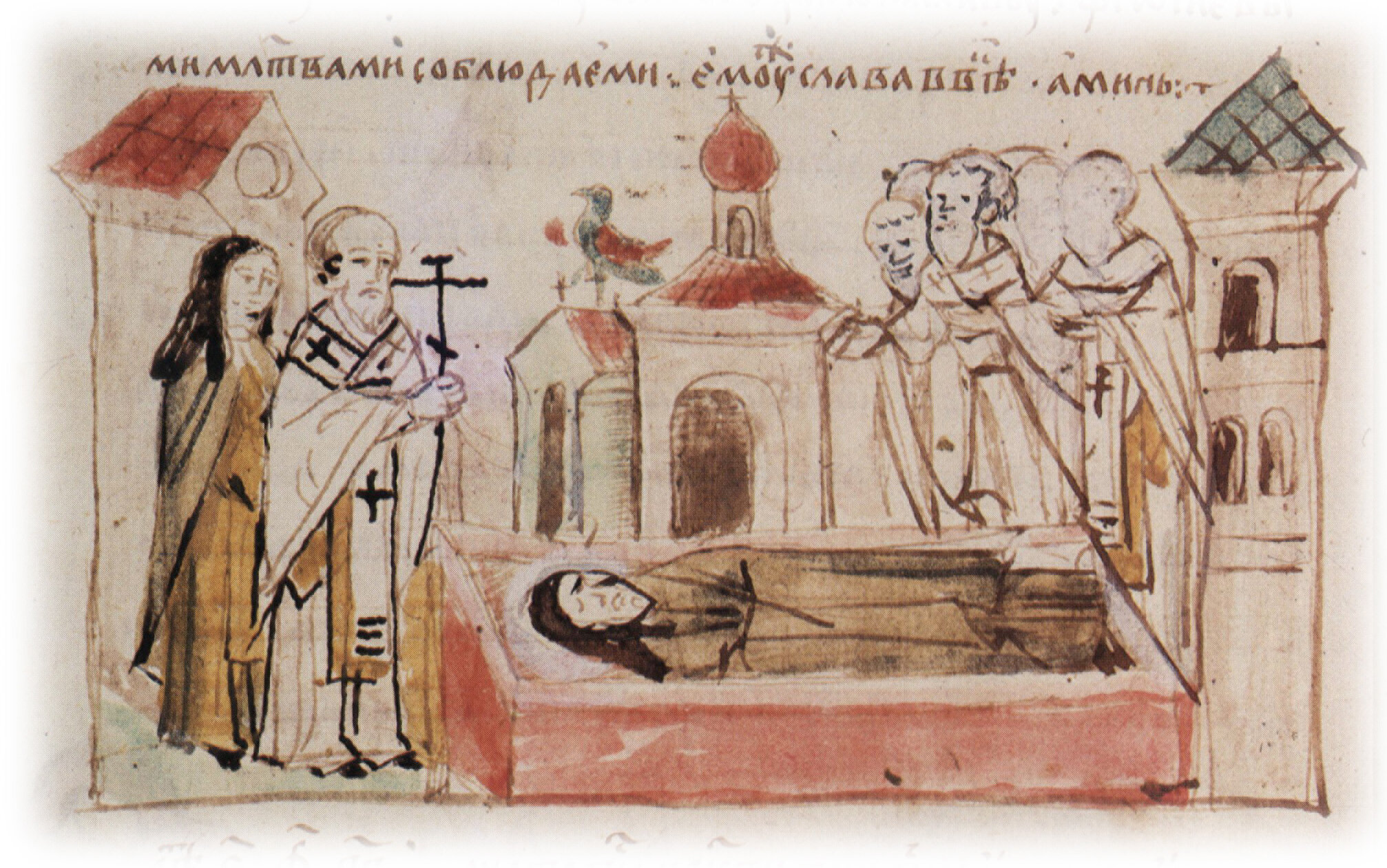 Тайное погребение Владимира Святославича, умершего в Берестове: спуск его тела на землю на ковре между разобранными клетьми здания; положение тела Владимира в мраморный гроб в церкви Святой Богородицы.