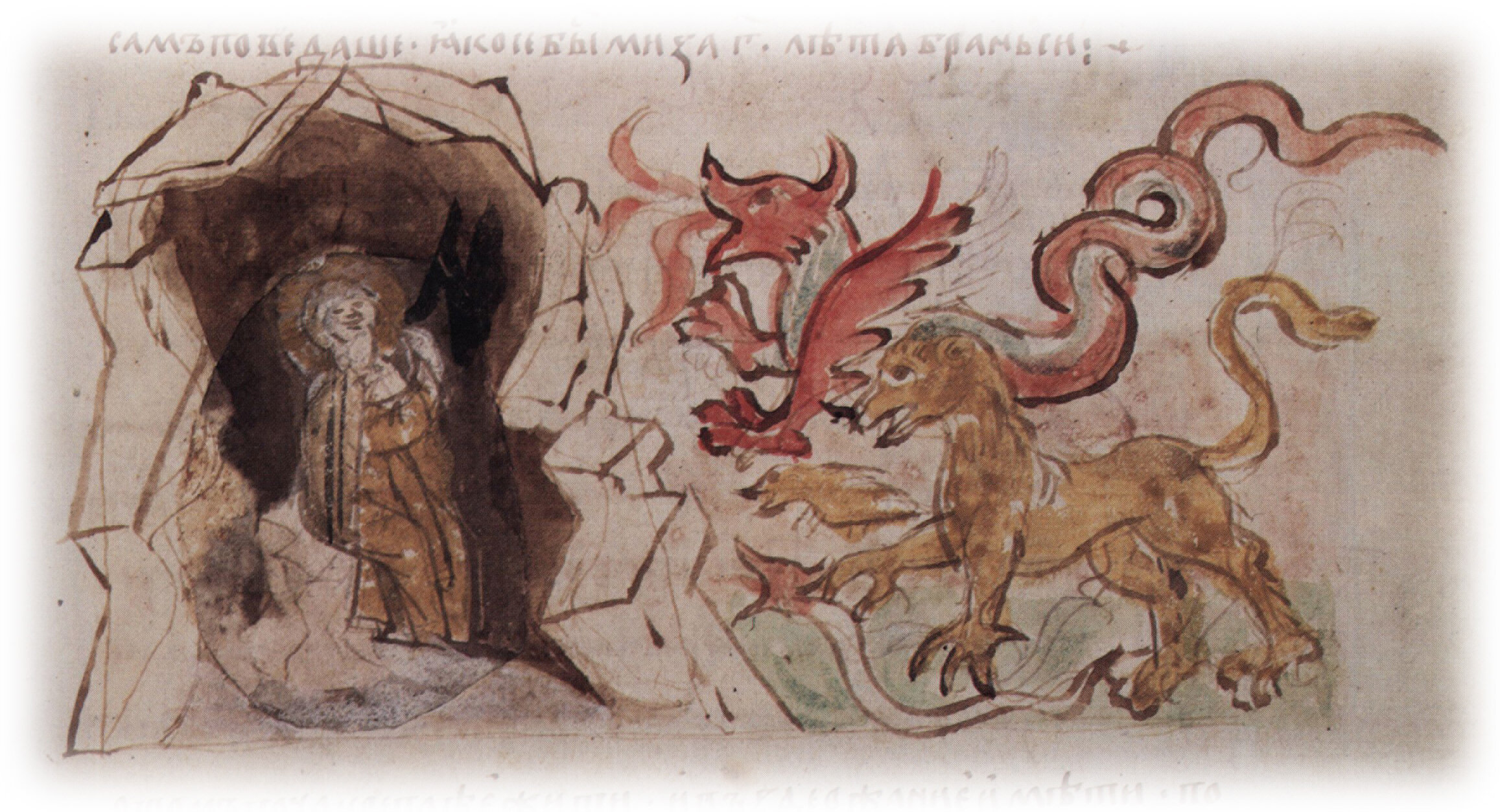 "А другойчи страшаху в образе медвежом, овогда же лютым, овогда же волом, овогда же змием ползяху к нему, ово жабы и мыши и всяк гад. И не возмогоша ему ничтоже со і порт и".