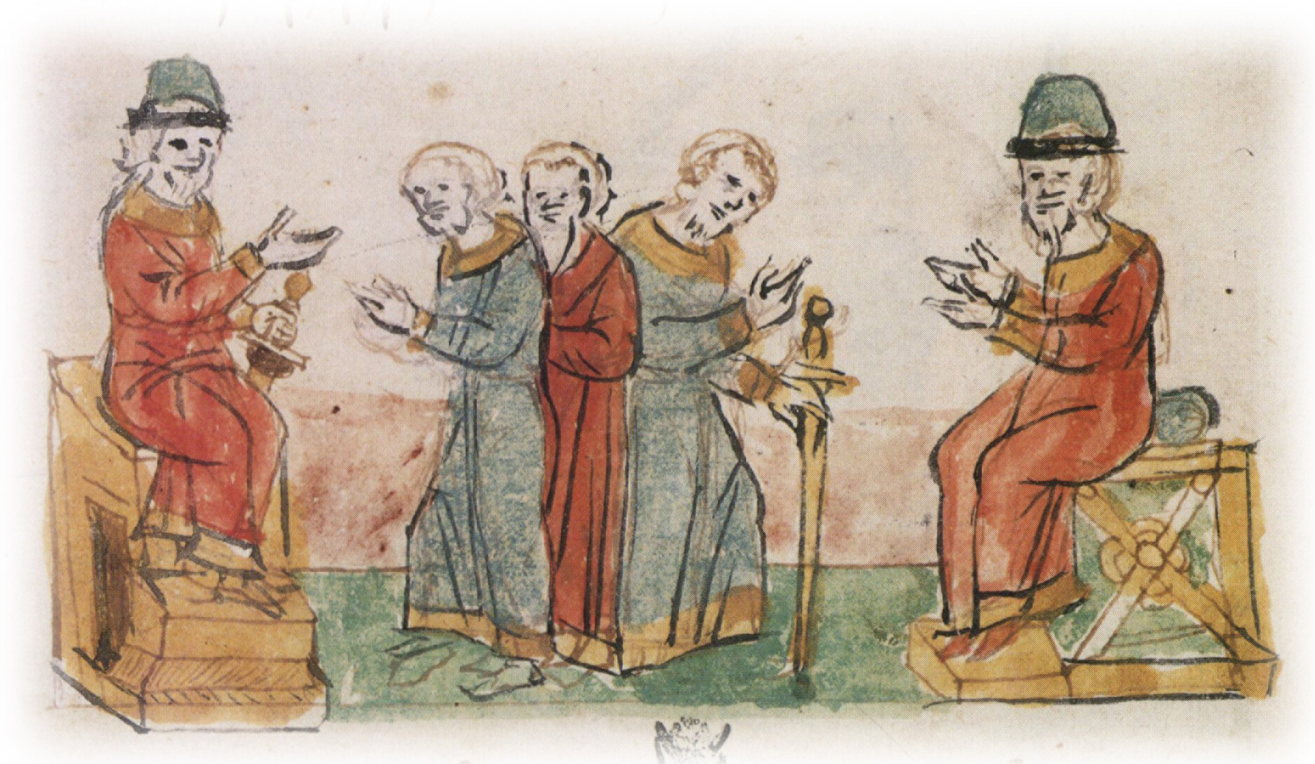 Рисунок "мастера Б" — перо. Правлен (фигуры, лица, шапки, меч справа, столы) "мастера В" — кисть,