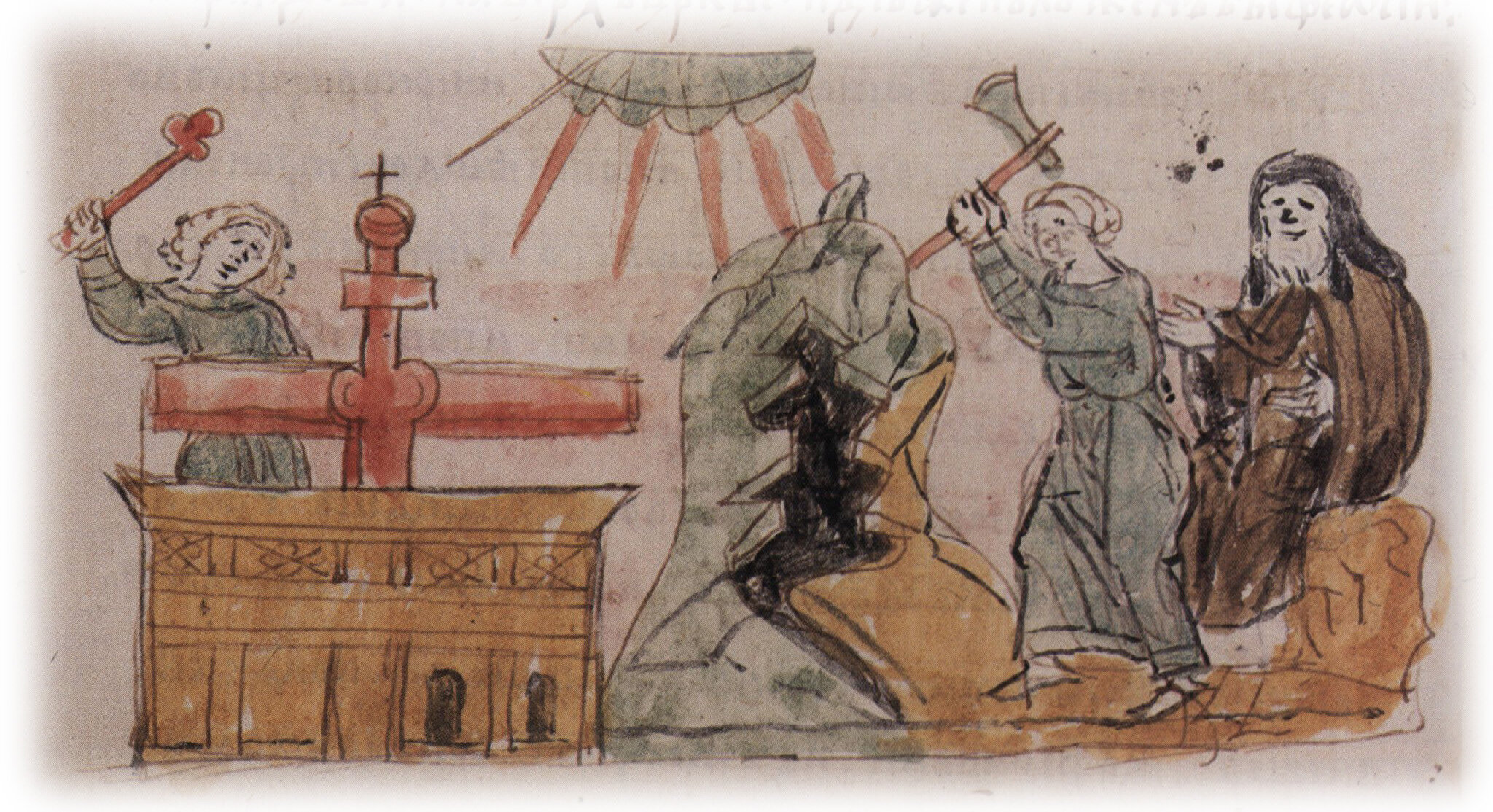 Тайное погребение Владимира Святославича, умершего в Берестове: спуск его тела на землю на ковре между разобранными клетьми здания; положение тела Владимира в мраморный гроб в церкви Святой Богородицы.