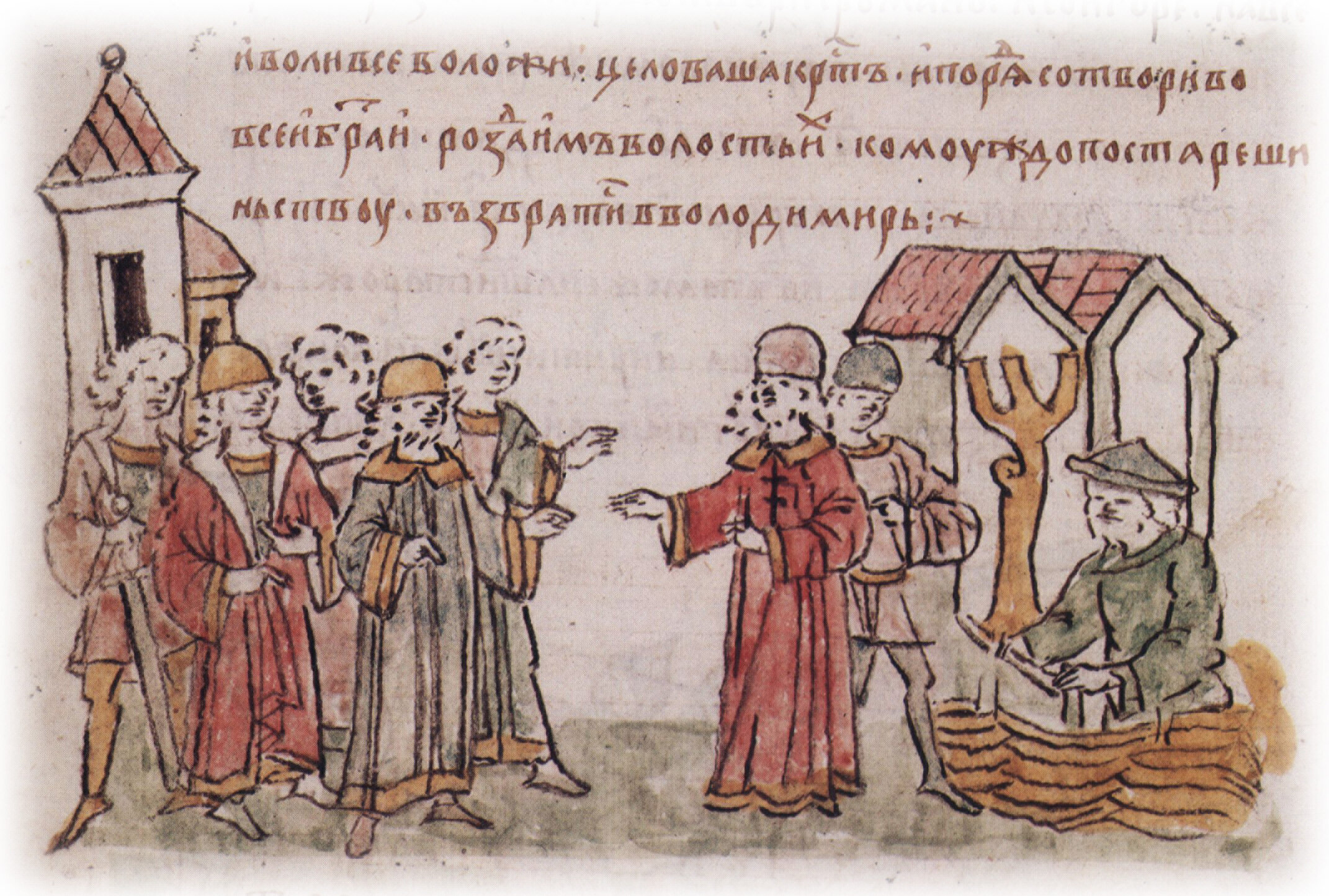 Кондаков Н. П. О миниатюрах Кенигсберского списка начальной летописи // Радзивиловская, или Кенигсбергская, летопись. СПб., 1902. Т. 2. Статьи о тексте и миниатюрах летописи. с. 126; Арциховский А. В. Древнерусские миниатюры как исторический источник. М./1944. с. 27; Подобедова О. И. Миниатюры русских исторических рукописей. К истории русского лицевого летописания. М., 1965. с. 69.