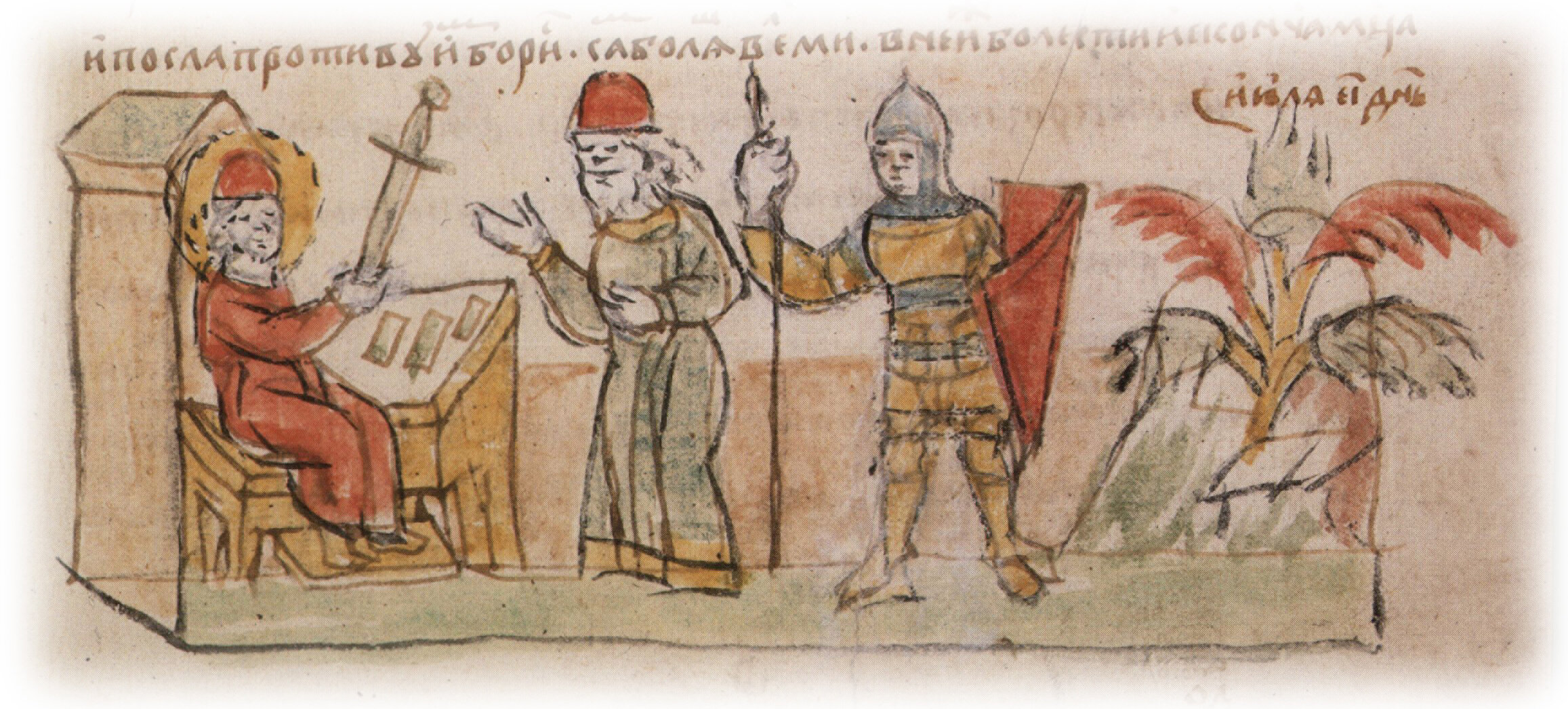 Вручение Владимиром Святославичем меча своему сыну, Борису Владимировичу, для борьбы с печенегами.