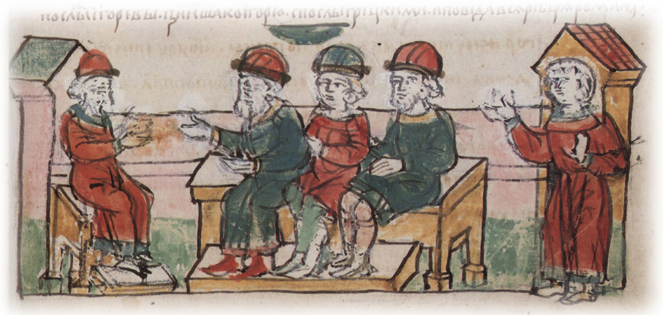 Прием Игорем русских и греческих послов и обсуждение с ними условий мирного договора.