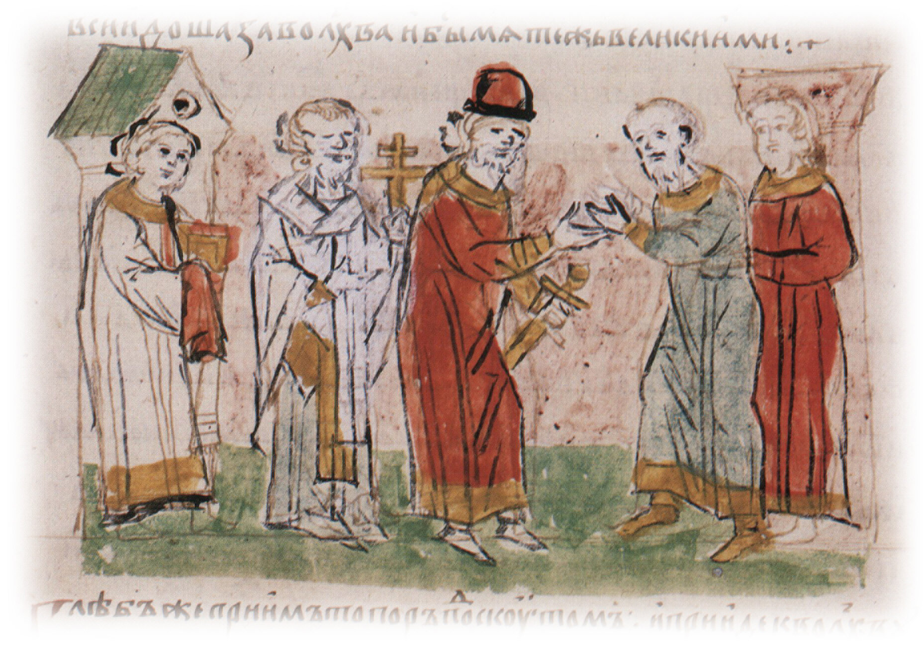"Епископ же, взем крест и облокся в ризы, и ста, рек: «Иже кто хощеть веру яти волхву... аще кто веруеть кресту, то за нь идеть».