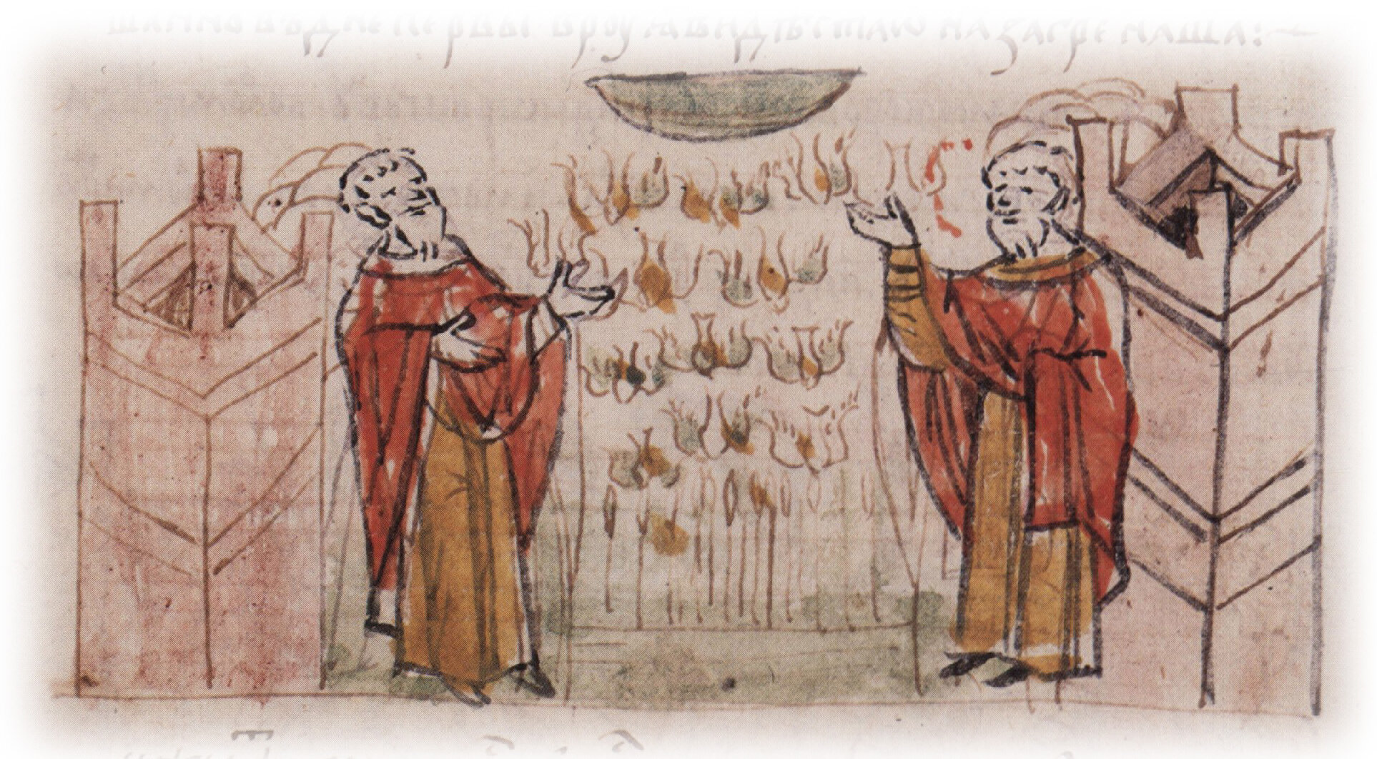 Тайное погребение Владимира Святославича, умершего в Берестове: спуск его тела на землю на ковре между разобранными клетьми здания; положение тела Владимира в мраморный гроб в церкви Святой Богородицы.