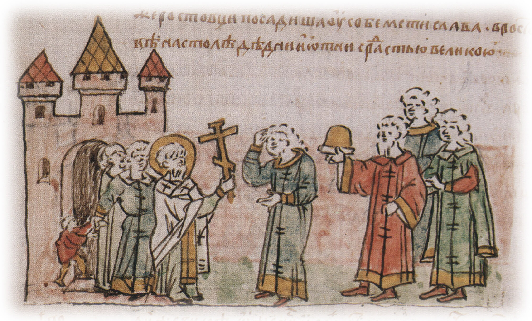 "Потом володимирци утвердившеся с Ростиславичама крестным целованием, яко не сотворити има в граде никакого зла. И выидоша со кресты противу Мстиславу и Ярополку".